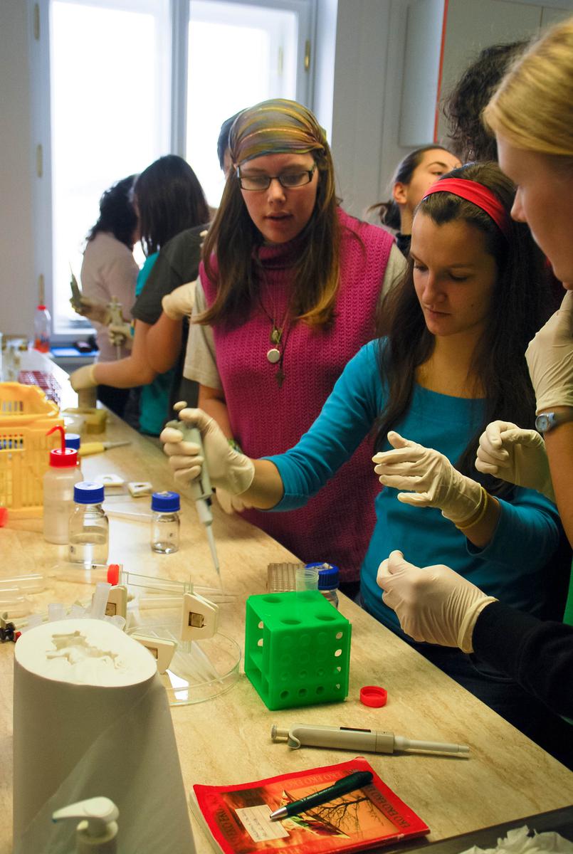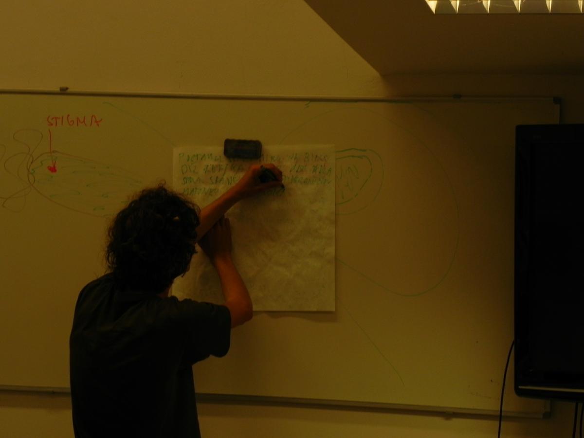 Po zevrubné úvodní přednášce o separaci bílkovin (Standa) v pátek následovaly v sobotu celodenní experimentální orgie na Viničné 5. Sestavujeme aparát vhodný k následující elektroforéze. Standa pak přinesl organické materiály plné bílkovin, každá z pěti skupinek dostala něco jiného a měla za úkol materiály rozšmelcovat. (Mléko, sója, kefír, brokolice, hlava lososa, kvasnice). Poté jsme se přesunuli do do Hopovy pracovny, kde Hop se Standou vařili pokrmy. Hop rozvařil špagety a Standa strčil vajíčko do mikrovlnky...Pokusy zatím probíhaly. Míša v mezičase přednášel o fotosyntéze.