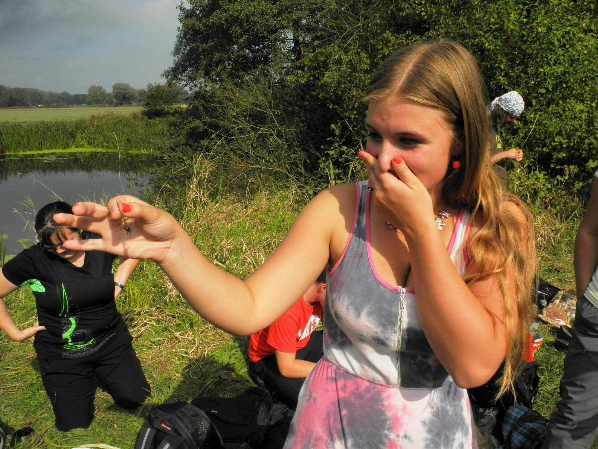 Po brzkém budíčku jsme se vydali na vlak, jež nás zavezl do Čelákovic. Odtud jsme se, za bouřlivé diskuze o parafyletických taxonech, vydali podél břehu Labe směrem k Přerovu nad Labem. Cestou jsme, jak už to tak bývá, pravidelně zastavovali a obdivovali místní biodiverzitu. Naším prvním cílem byly dvě tůně, kde kdysi prováděl své výzkumy profesor Hrbáček. Část výpravy se ihned jala zkoumat a lovit místní biodiverzitu -- mezi obzvláště pěkné úlovky patřila jistá vážka (omlouvám se všem zasvěceným, leč to je asi nejlepší jméno, které jsem schopen pro onu myšičku dát dohromady). Zbytek z nás se hladově vrhnul na své svačiny a při jejich predování jsme se oddávali všemožným diskuzím, jejichž výsledkem byl například vznik náboženství uctívající svaté vodíkové můstky.