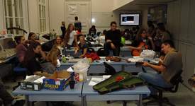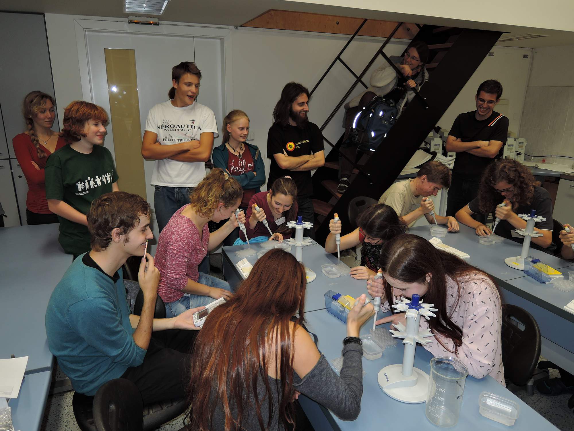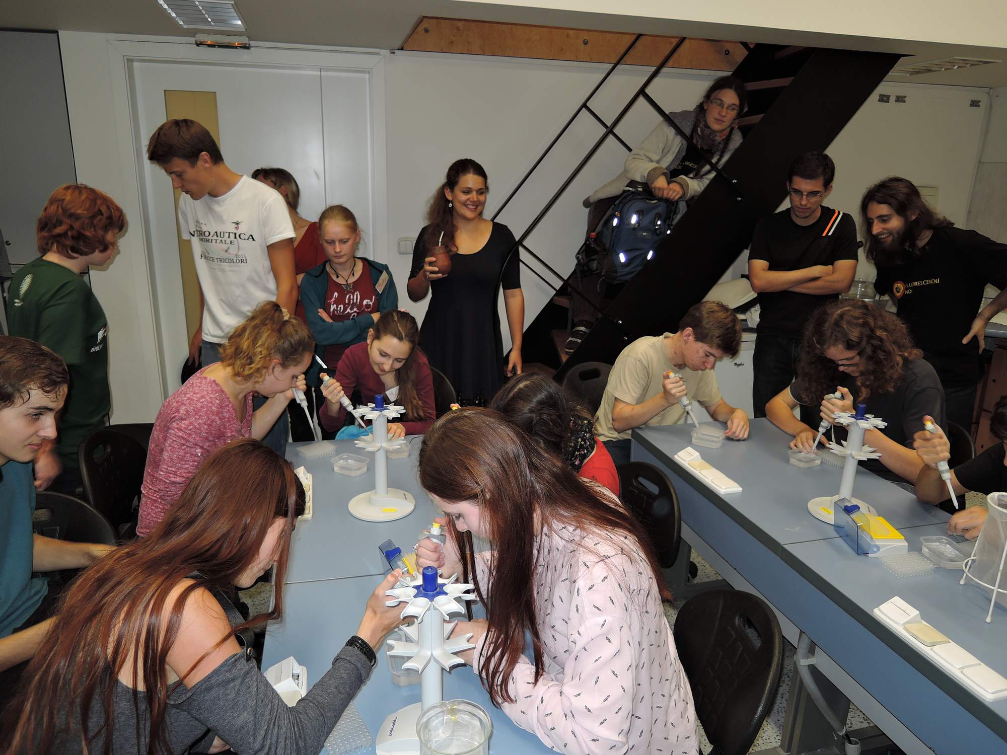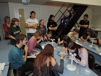 V dalším průběhu večera jsme se věnovali mikroskopování, biologickým (a asi i jiným) diskusím či prohlížení výstavky. Proběhla také velmi vzrušující soutěž v pipetování automatickými pipetami. Cílem bylo napipetovat mřížku co nejrychleji a s co největší přesností. Soutěžcí byli během svého výkonu hojně povzbuzováni obecenstvem, ale nevím, jestli to mělo na jejich výkon spíše pozitivní nebo negativní vliv. Část lovců a sběračů se také vydala na Albertovské stráně.