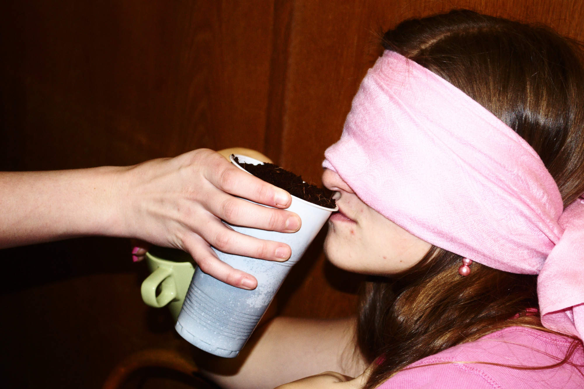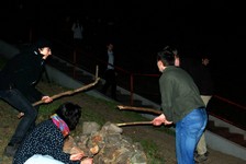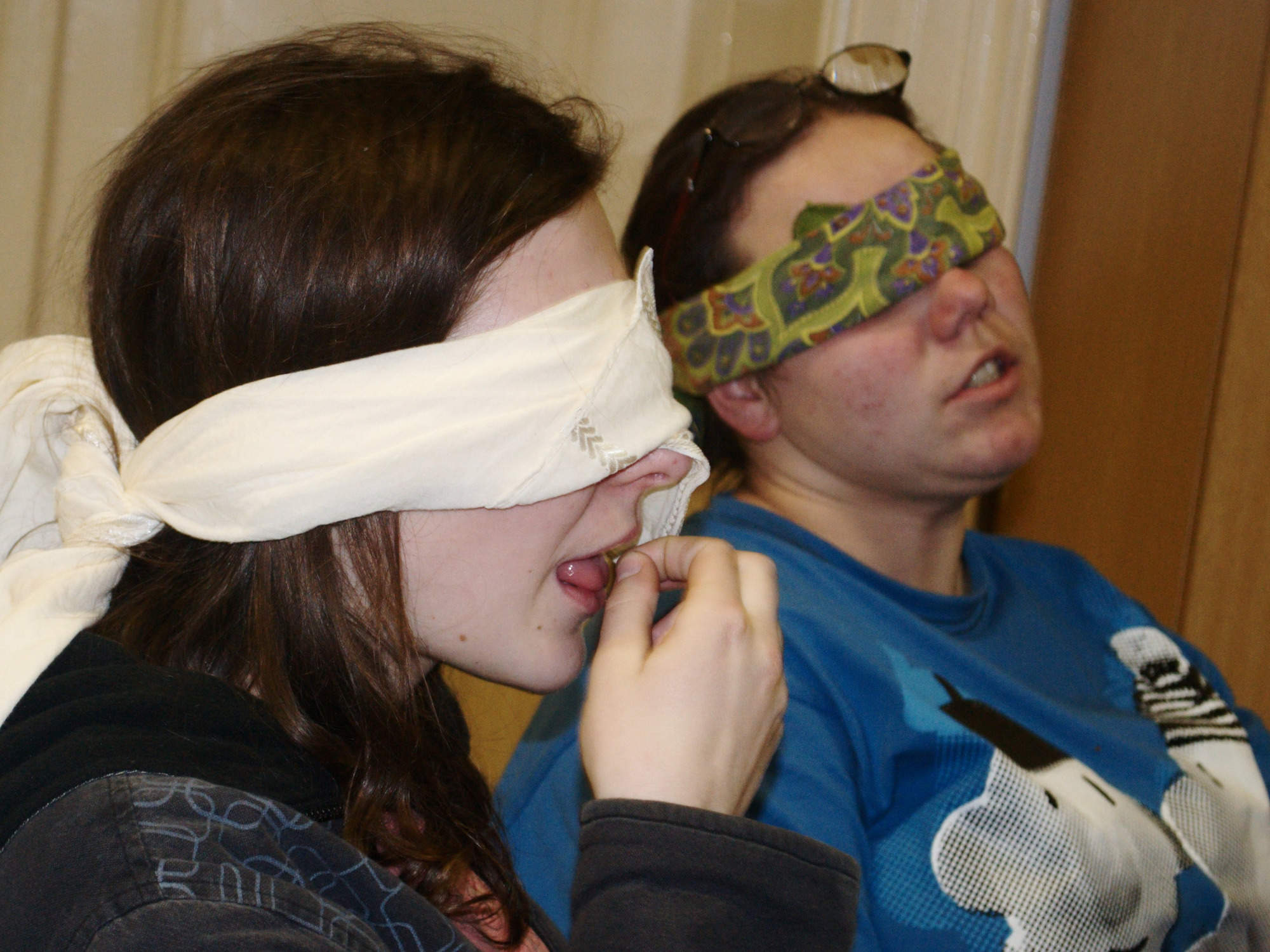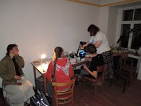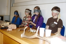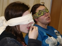 Následovalo představování a velmi příjemná část dne- večeře. Po té nás čekala nevizuální poznávačka. Ta se skládala z pěti částí, ve kterých proti sobě soutěžilo pět skupin. V první části jsme poznávali velké objekty po hmatu. Měli jsme zavázané oči a postupně nám byly do rukou dávány různé objekty například mnohonožka, potkan, tři druhy parohů, kniha Zamrzlá evoluce nebo velký kus korku. V druhé části nás čekalo poznávání objektů po čuchu. Pro některé to byl velice silný zážitek, když si pořádně čuchli trusu Míšových potkánků nebo durianu, i když Albert tvrdí, že durian voní. Třetí část byla o poznávání menších objektů po hmatu. Strkali jsme ruce do pytlíků a měli jsme poznat třeba bělozubku, rejska, moučné červi, slídu, štětinu slona či stoličku krávy. Na předposledním stanovišti jsme vyzkoušeli náš chuťový vjem. Bylo nám podávané různé pochutiny, jako jsou třeba smažení mouční červi, česnek, antimed či lignocel. Poslední jmenované byla obzvlášť lahůdka. Nakonec jsme prověřili náš sluchový aparát. Toto stanoviště bylo jednoznačně nejtěžší, neb snad pokaždé jsme tipovali skřehotající žábu. Bohužel jsme se trefili jen jednou. Jelikož se poznávačka velmi protáhla, většina účastníků hned po ní zalehla do svých spacáků.