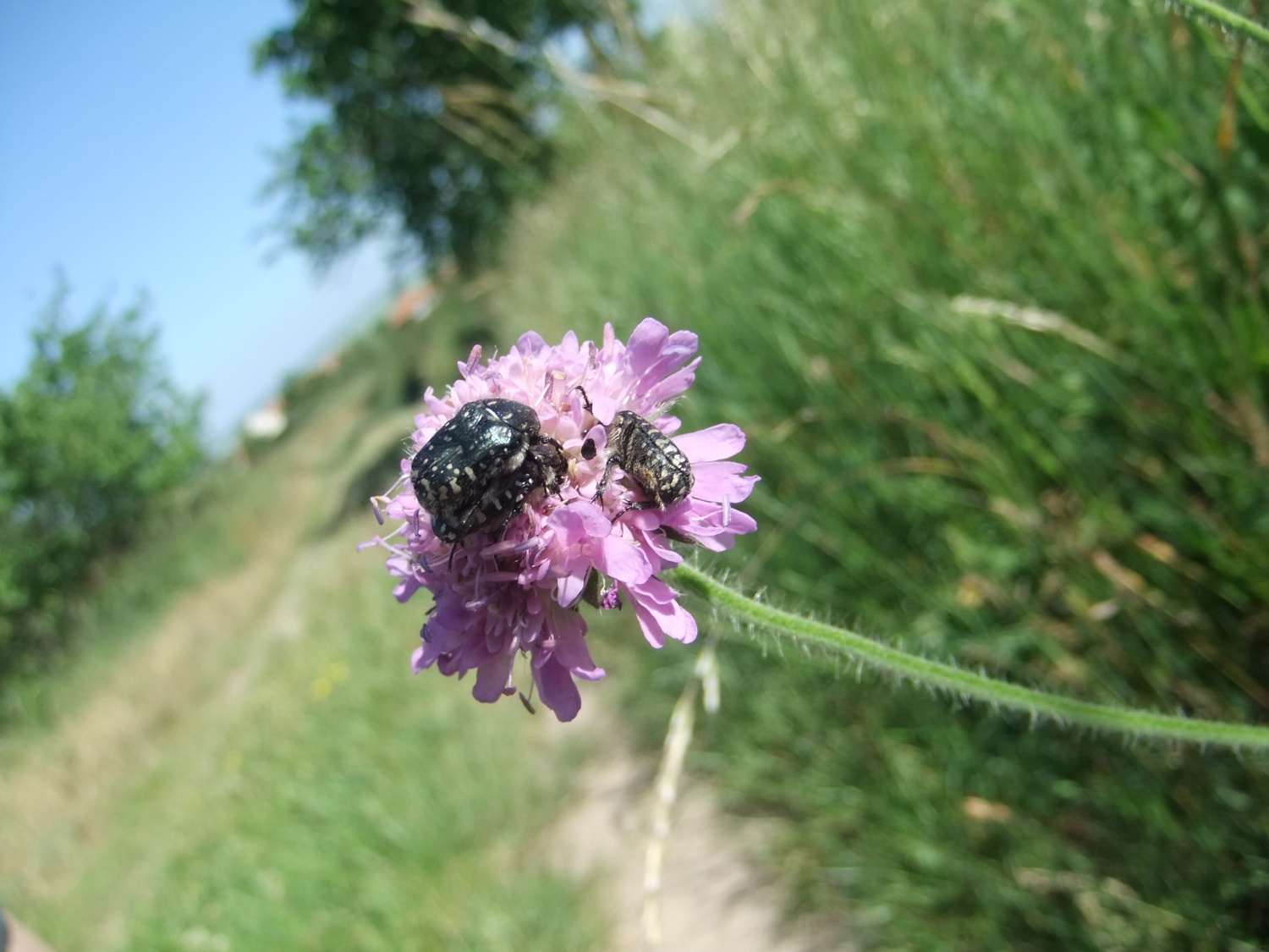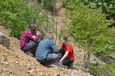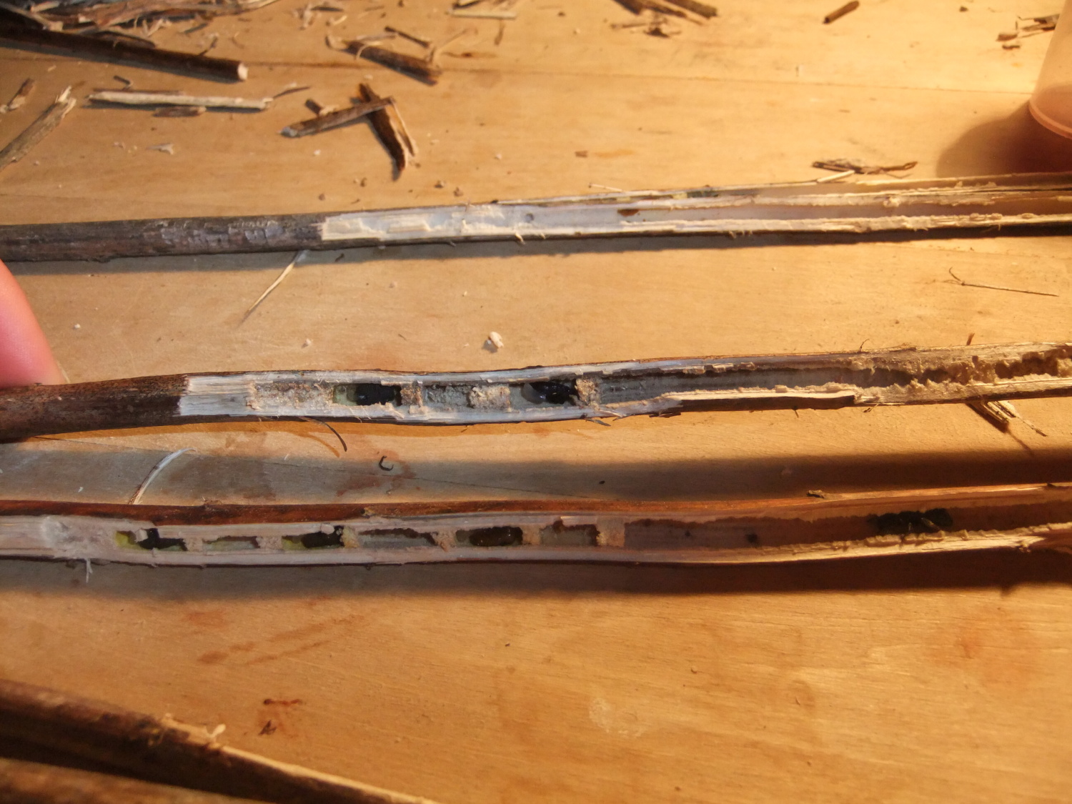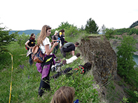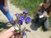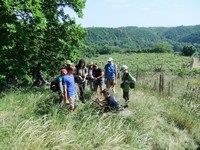 V druhé části exkurze nalezli například pěkné otisky trilobitů, bylo nám demonstrováno několik více či méně ščagelovitých rostlin. V potoce jsme nalezli spousta charismatických ploštěněk potočních. Nesli jsme ssebou také několik poměrně velkých otepí celíku kanadského, z kterých jsme postupně olamovali květenství a vršky. Celíky sbíral Míša, aby z nich připravil snopky na svůj výzkum v Podyjí, kde se věnuje rodičovské péči včel rodu Ceratina, které v dutých stopkách celíku i dalších rostlin hnízdí.