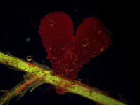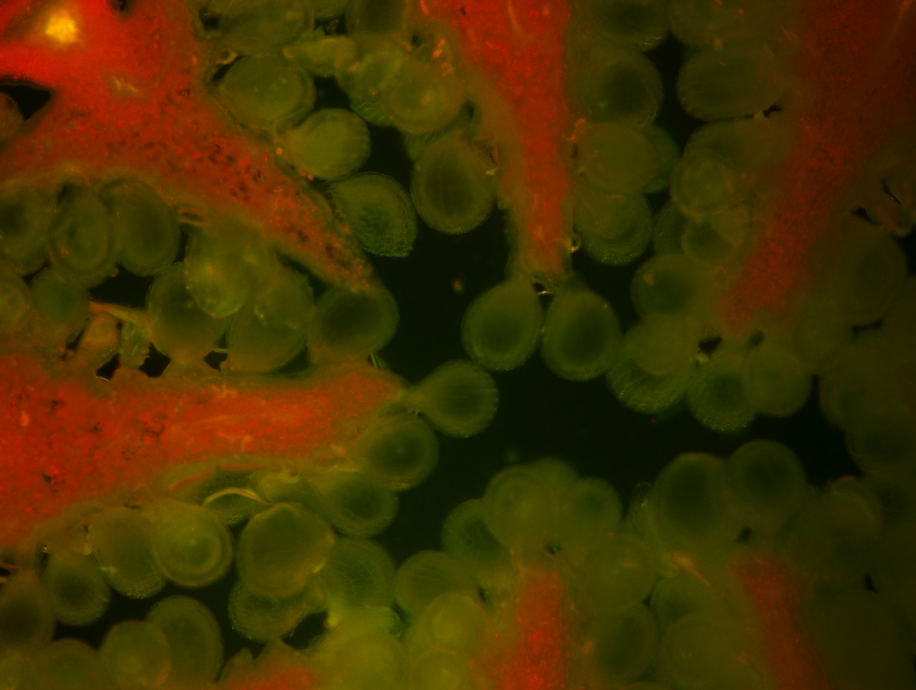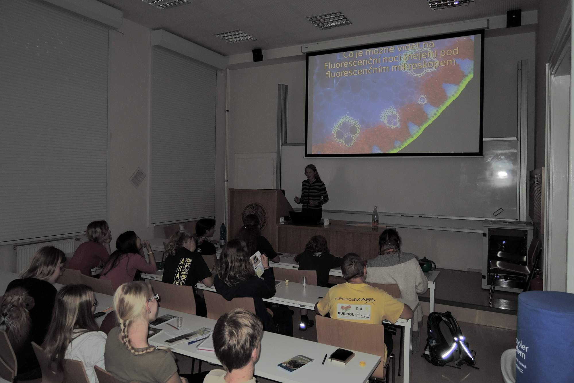 Po krátké přestávce následovala přednáška Evči Matouškové a tom, co je možné vidět na fluorescenční noci (nejen) pod fluorescenčním mikroskopem. Kromě navnadění k tomu, co vše můžeme na fluorescenční noci pozorovat, jsme se dozvěděli i o principech fluorescence a fungování fluorescenčního mikroskopu. Nejkrásnější byly samozřejmě barvami hýřící fotografie fluoreskujících objektů vytvořené na předchozích fluonocích.