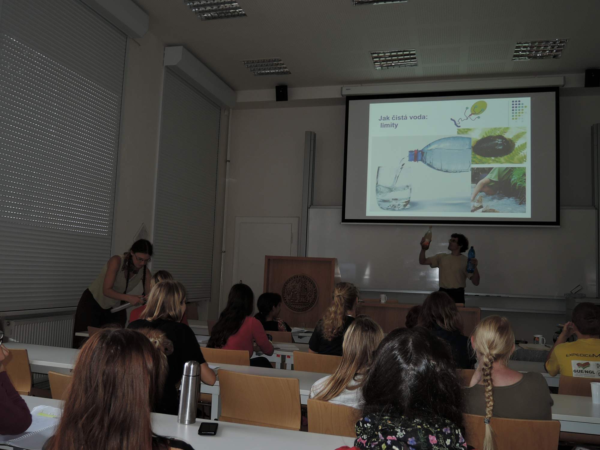 Před třetí hodinou jsme se všichni shromáždili ve velké antropologické posluchárně, kde následně proběhla přednáška Ondřeje Simona o ochraně vodních ekosystémů. Dozvěděli jsme se, oč je těžší chránit velevruba tupého než hořeček český, kdy se v Praze ještě pila voda z Vltavy a že ochrana čistoty vody a vodních ekosystémů je hodně složitá. Byly nám také předloženy dva vzorky vody, u kterých jsme měli určovat některé parametry, jako třeba zákal, pH, vodivost, obsah rtuti, přítomnost baktérií a množství rozpuštěného vápníku. Jediné, co jsme poznali, byl zákal, který byl také jediným „měřeným“ parametrem, který se u vzorků lišil (jednalo se o vodovodní vodu „čistou“ a vodovodní vodu s přídavkem kávovinového nápoje Melta a kakaa). Na závěr přednášky jsme měli ve skupinkách navrhnout komplexní postup ochrany některého úseku českých řek a říček, což se nám dařilo významně lépe, než jazyko- a okometrický rozbor vody.
