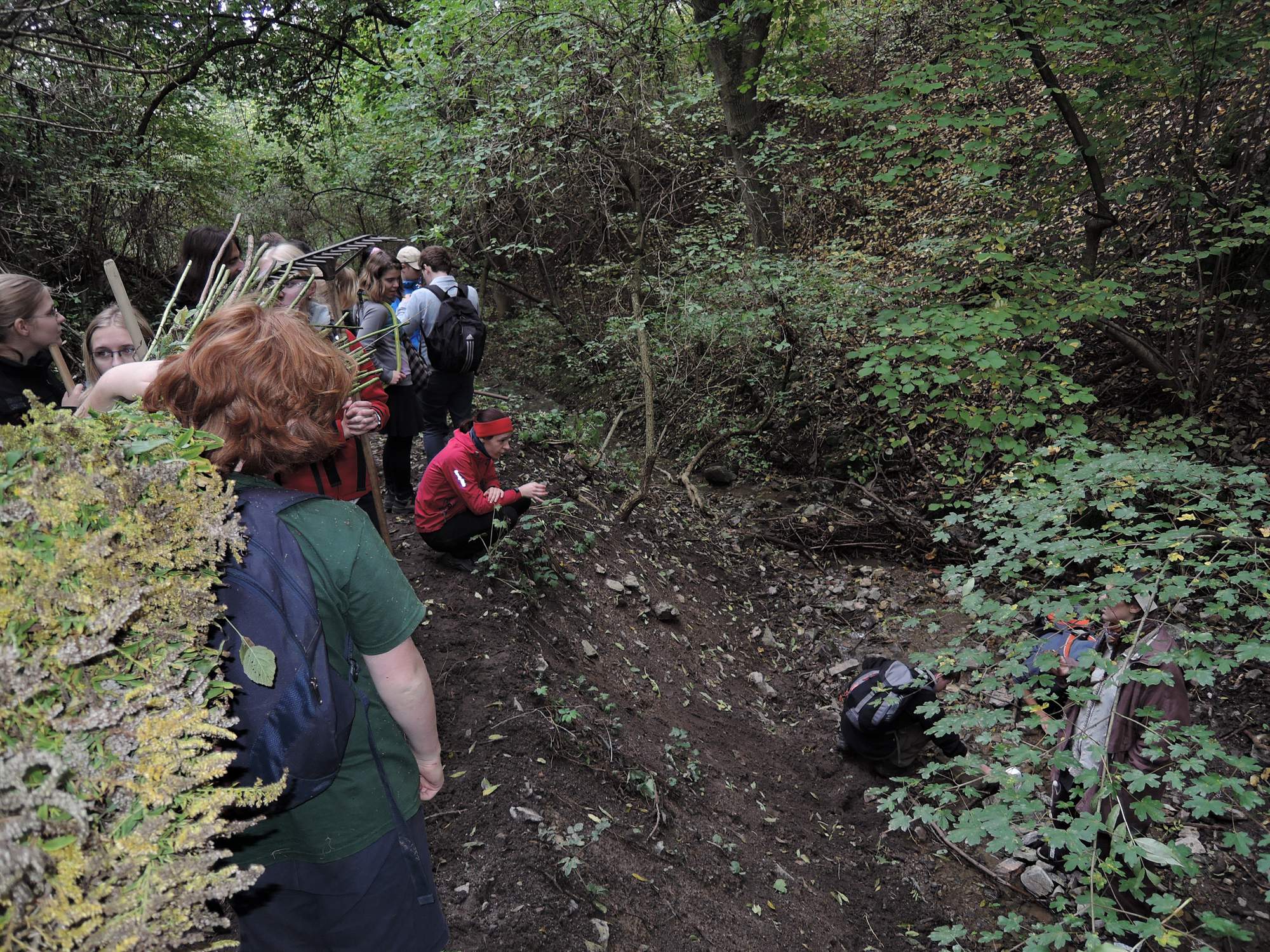 Zanedlouho jsme z kosořské zastávky dorazili do Černé rokle, kde probíhala ústřední činnost sobotního dne, totiž brigáda. Naším úkolem bylo zredukovat množství náletových a invazních dřevin a ještě více tak rozšířit stepní plochy na jižním svahu rokle. Vzniklo více pracovních skupin - část lidí shrabávala trávu a starou biomasu, další se s nůžkami a pilkami vrhli na náletové křoviny a dřeviny, několik lidí jen odtahávalo odřezané větve na velkou hromadu. V rokli pracovaly i speciální jednotky vždy dvou neohrožených likvidátorů, z nichž jeden odstraňoval invazní svídu a druhý potíral řezné rány pesticidem (růžovoučké barvy a neodpovídajícího nežvýkačkového chemického zápachu). Chtěli jsme tak docílit toho, že svída pesticid natáhne až do kořenů a opravdu odumře – bez použití pesticidu by zanedlouho obrazila asi jako mýtická hydra (a možná by ji ani opalování řezných ran nezastavilo).