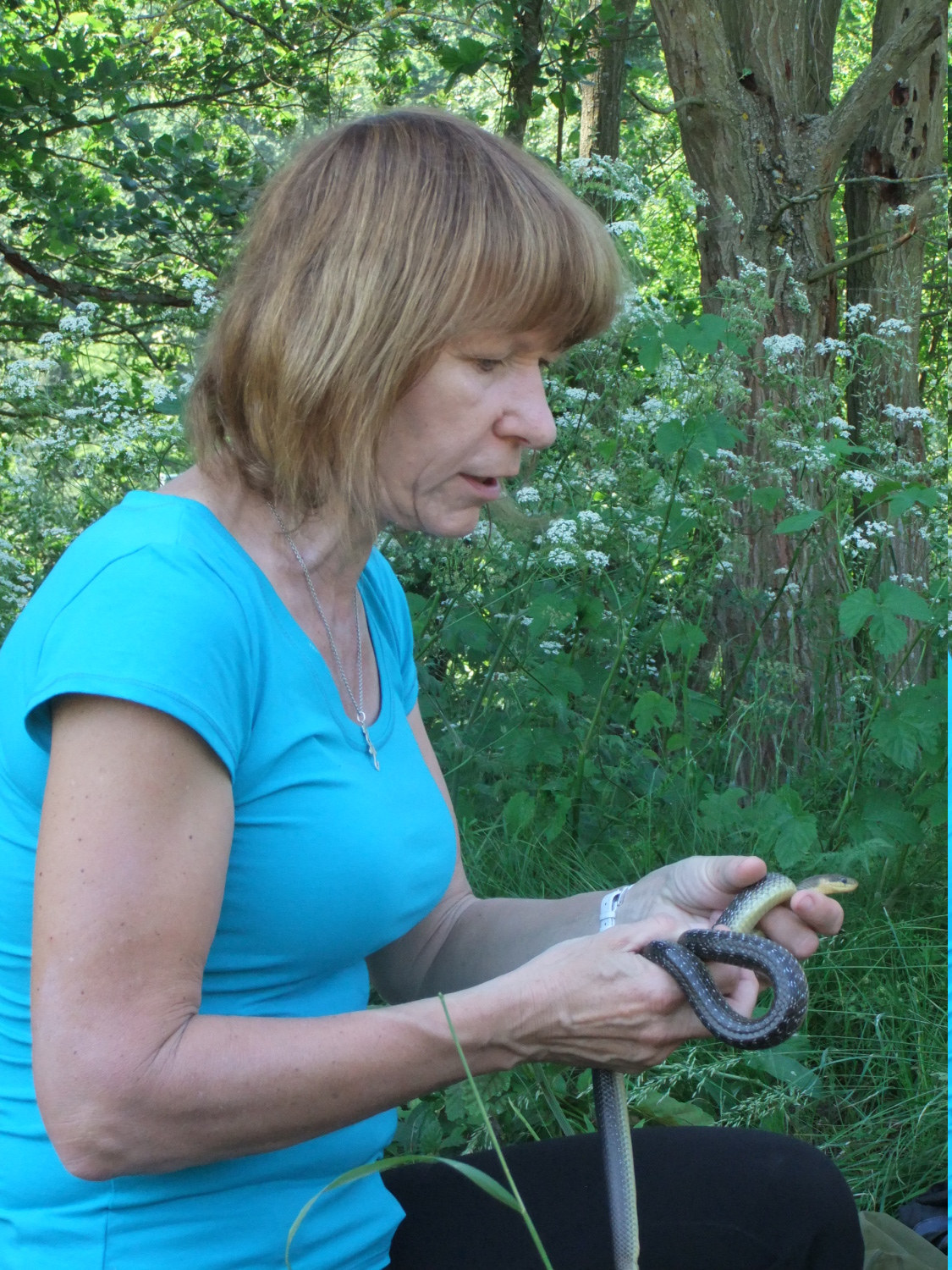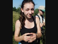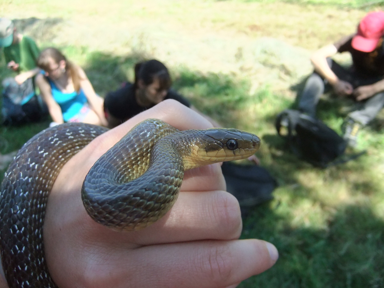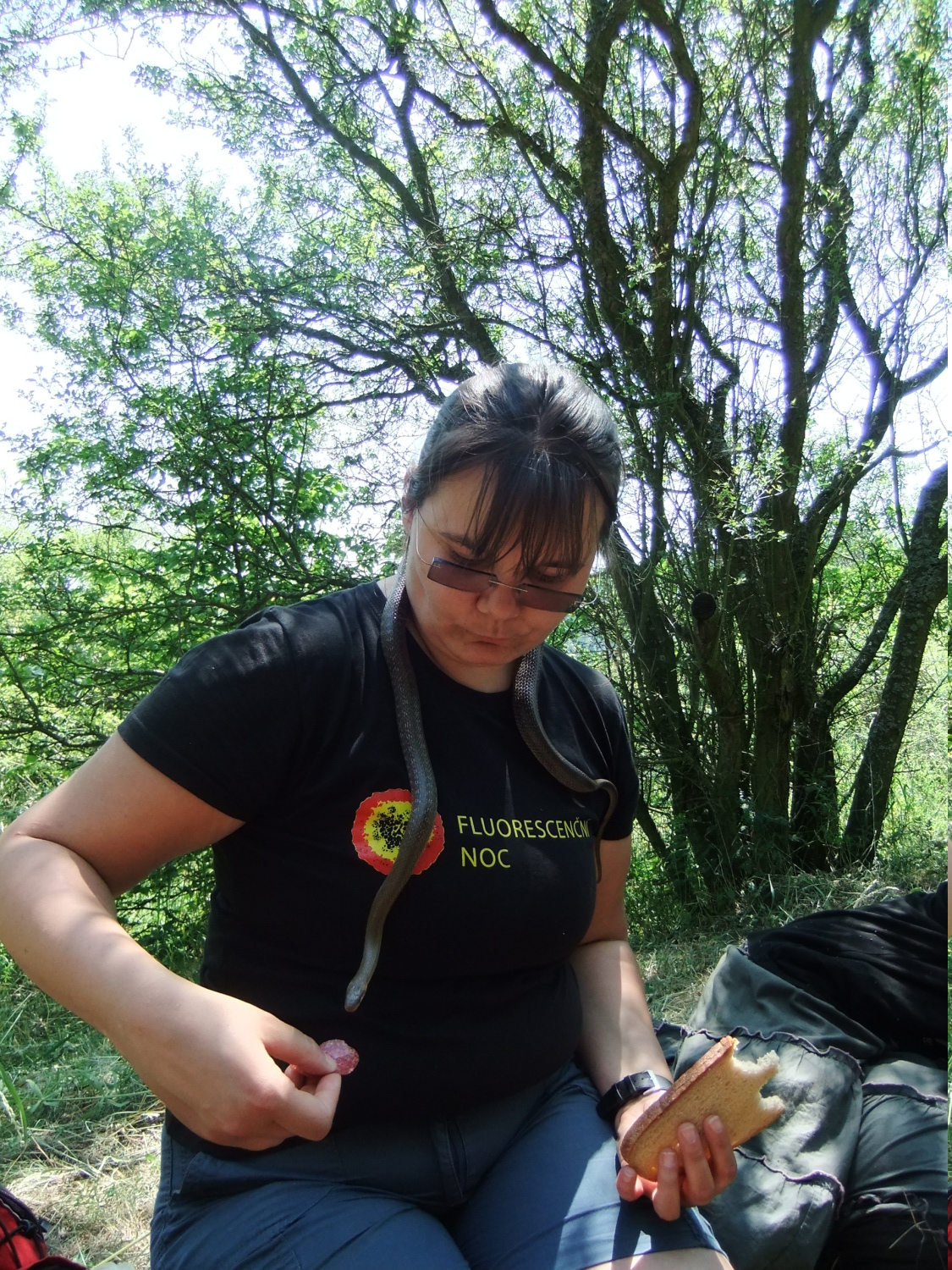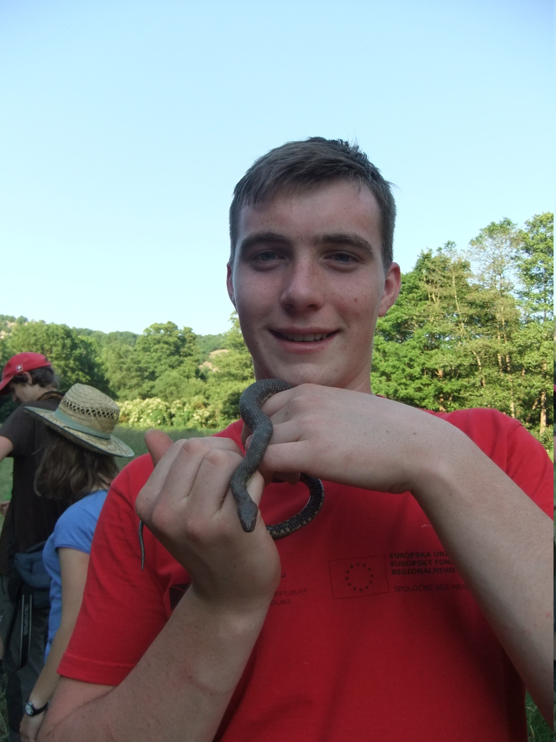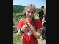 Míšův ,,budíček větší“ vytrhl ze spaní většinu účastníků už v osm ráno a o hodinu později jsme vyrazili směr Šobes. Přes vřesoviště až k Dyji jsme došli celkem rychle, přestože jsme cestou nevynechali jedinou zajímavou biodiverzitu – musím zmínit například Celiinu houbičku Epichloe typhina, protože to byla myšička. Cestou jsme také potkali cosi, co mohlo být kolomazivou gibsodrážkou, a tak jsme raději provedli rituál s Rorippou islandicou a tento nebezpečný objekt opatrně obešli. U Dyje byla pauza na oběd a na koupání. Nebyl by to Koštíř, kdyby se hned nešel vykoupat. Rozjímání u řeky narušila zpráva o první chycené užovce stromové, která vyvolala všeobecné nadšení. Zároveň dorazila Blanka Mikátová, takže jsme měli k chycené užovce i odbornou přednášku. Dozvěděli jsme se, že místní užovky jsou značkovány a sledovány a vyskytují se zde hlavně na zídkách, které tvoří hranice jednotlivých vinohradů. Také víme, že se zde dají nalézt všechny naše užovky, ale my jsme měli štěstí jen na tři z nich – obojkovou, stromovou a podplamatou. Po odprezentování první Aeskulapky jsme zamířili na Šobes. Zde jsme procházeli postupně zídky a doufali, že se nám podaří ještě nějakou užovku odchytit. První, kdo získal Aeskulapův řád, byl Zbojník. Jeho výstavní exemplář užovky stromové byl 146 cm dlouhý a za celou dobu ho nikdo nepřekonal. I já jsem později odchytila svou užovku. Je zajímavé, že všechny užovky, které jsme chytily, byli samci, až na jedinou, kterou chytila Kristýna. Tato samička byla slavnostně pojmenována Stoosma. Celkově se nám za odpoledne podařilo nachytat sedm užovek stromových, což bylo naprosto skvělé. Všechny byly řádně označkovány pomocí kombinace zástřihů do břišních šupin, změřeny, zváženy a vypuštěny zpět. Všechny dostaly i jméno, například Durian, Chrudoš, Zbojník, Tamarind, Stoosma… Naskytl se nám i jeden úžasný výjev – na zídce jsme zahlédli dvě pářící se užovky stromové. Je dobře, že se postaraly o další generaci. Nicméně my jsme se vydali na vrchol Šobesu a poté směrem zpět k Dyji. Cestou jsme náhodou narazili na velmi důležitý objekt a to na Míšův snopek číslo 1. Z rostlin zde kvetli například kosatce pestré a rmeny barvířské. Ve vinařské chajdě se nacházel plch velký. Jakožto krásnou myšičku, rozhodl se Albert, že ho odchytí. Plch byl opravdu krásná myšička, ale kousal pořádně a Albertovi nepomohly ani rukavice – přesto díky jeho postřehu a odvaze jsme si mohli plcha všichni prohlédnout. Poslední zastávka toho dne se konala na Lipinské louce, kde jsme nakoukávali pod plachty a doufali, že zde bude odpočívat nějaký plaz. Nalezli jsme dva slepýše a dvě užovky podplamaté. Obě byly velice naštvané, když jsme je vyrušili a daly nám to patřičně najevo – někteří účastníci si tak odnesli i ,,voňavý“ zážitek. Po návratu na faru na nás čekal Matyáš s moc dobrým buřtgulášem. Predací večeře však sobotní program nekončil, neb Míša provedl pitvu hnízda včel rodu Ceratina, na kterých provádí zde v Podyjí výzkum. Většina účastníků se ještě po setmění vydala na lov nočního hmyzu na světlo. Bylo vidět mnoho nočních motýlů a lišajů a také se chytil krásný sameček roháče obecného.