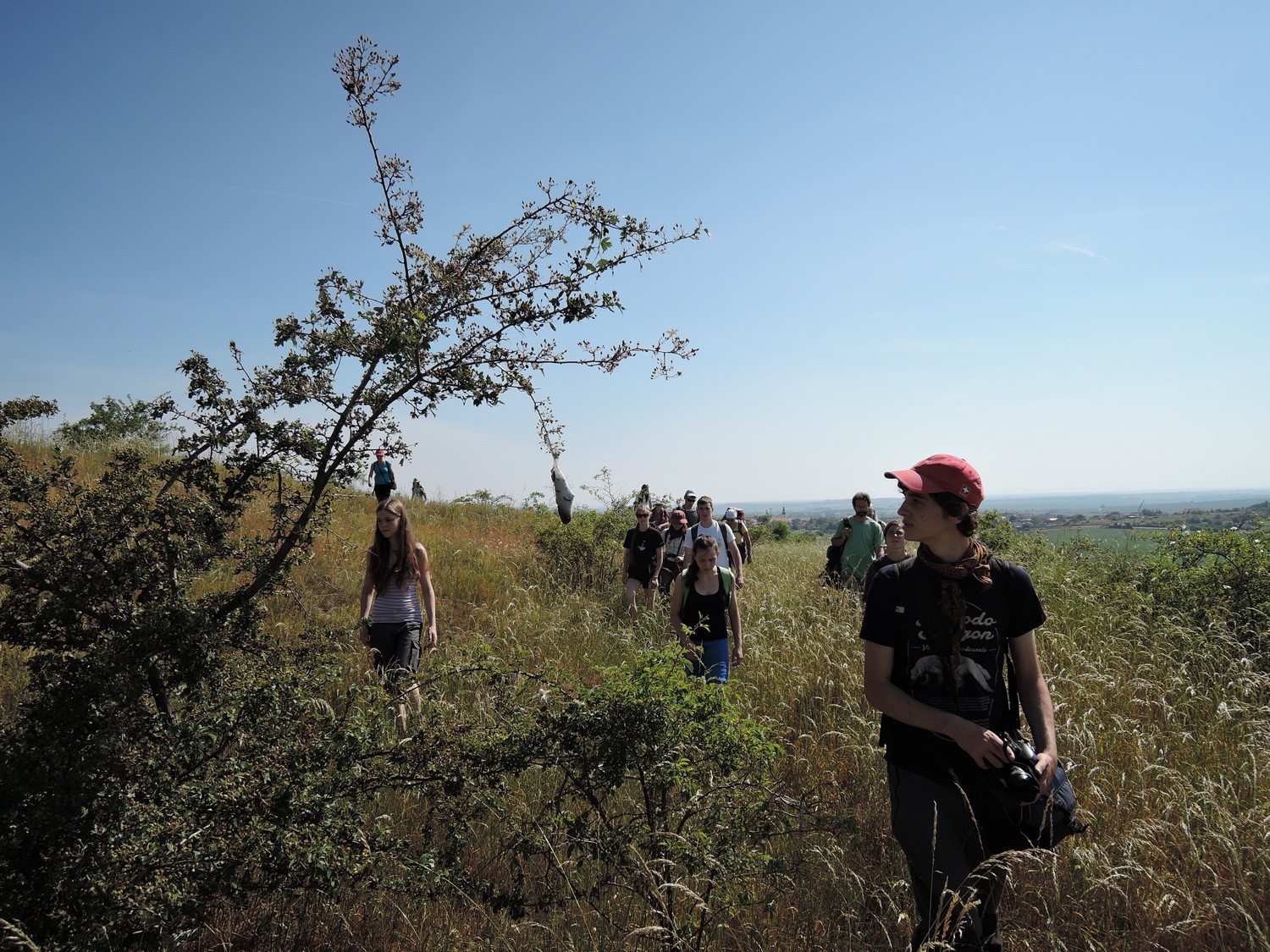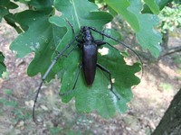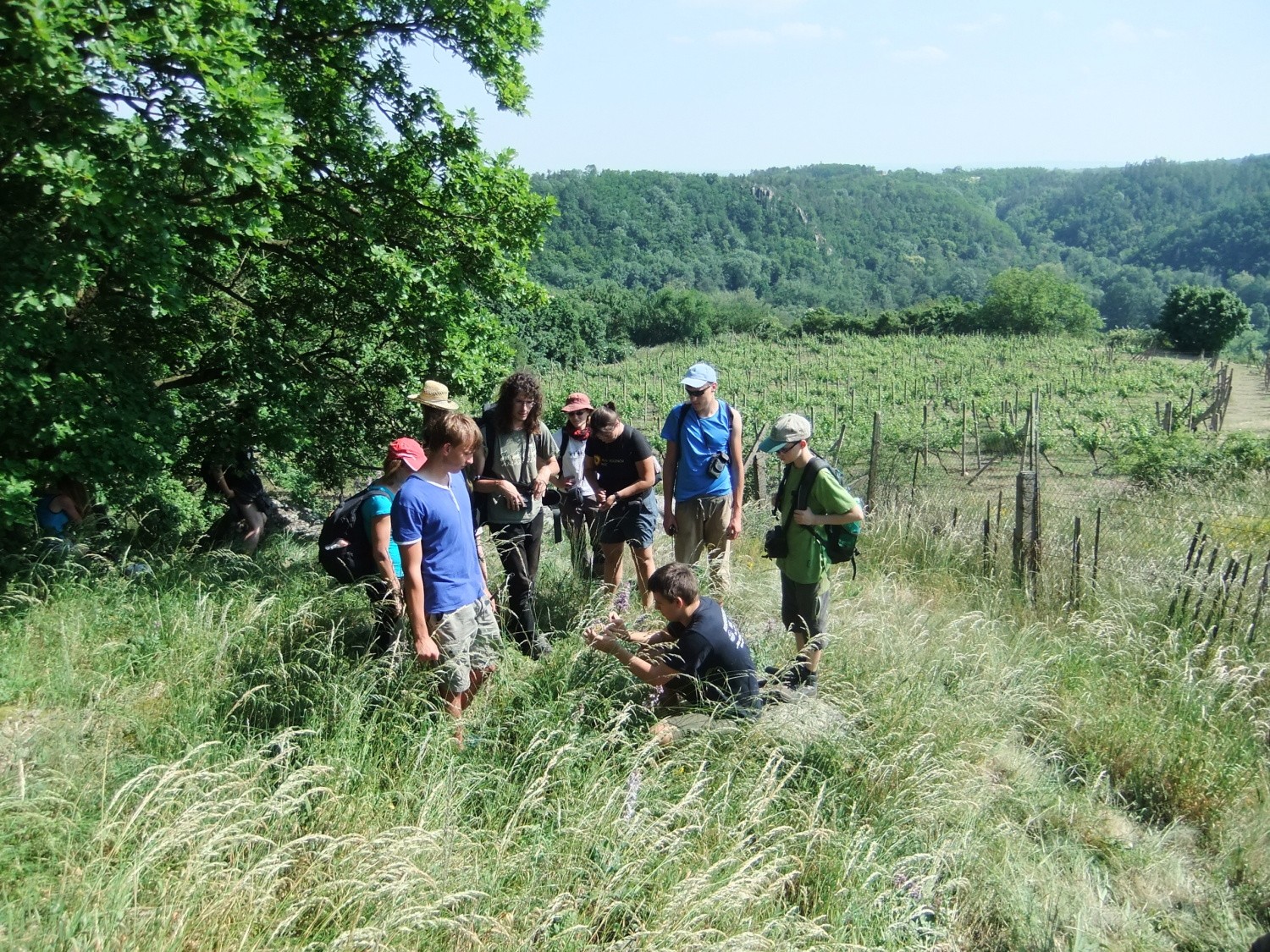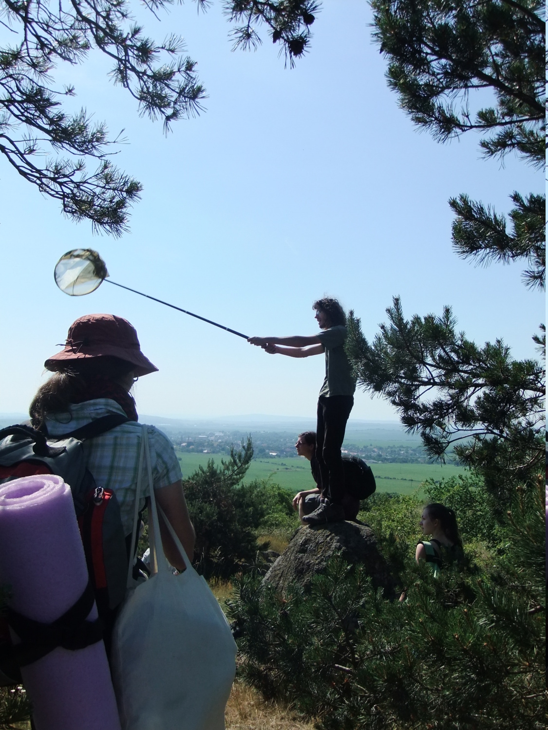 Míšův ,,budíček větší“ vytrhl ze spaní většinu účastníků už v osm ráno a o hodinu později jsme vyrazili směr Šobes. Přes vřesoviště až k Dyji jsme došli celkem rychle, přestože jsme cestou nevynechali jedinou zajímavou biodiverzitu – musím zmínit například Celiinu houbičku Epichloe typhina, protože to byla myšička. Cestou jsme také potkali cosi, co mohlo být kolomazivou gibsodrážkou, a tak jsme raději provedli rituál s Rorippou islandicou a tento nebezpečný objekt opatrně obešli. U Dyje byla pauza na oběd a na koupání. Nebyl by to Koštíř, kdyby se hned nešel vykoupat. Rozjímání u řeky narušila zpráva o první chycené užovce stromové, která vyvolala všeobecné nadšení. Zároveň dorazila Blanka Mikátová, takže jsme měli k chycené užovce i odbornou přednášku. Dozvěděli jsme se, že místní užovky jsou značkovány a sledovány a vyskytují se zde hlavně na zídkách, které tvoří hranice jednotlivých vinohradů. Také víme, že se zde dají nalézt všechny naše užovky, ale my jsme měli štěstí jen na tři z nich – obojkovou, stromovou a podplamatou. Po odprezentování první Aeskulapky jsme zamířili na Šobes. Zde jsme procházeli postupně zídky a doufali, že se nám podaří ještě nějakou užovku odchytit. První, kdo získal Aeskulapův řád, byl Zbojník. Jeho výstavní exemplář užovky stromové byl 146 cm dlouhý a za celou dobu ho nikdo nepřekonal. I já jsem později odchytila svou užovku. Je zajímavé, že všechny užovky, které jsme chytily, byli samci, až na jedinou, kterou chytila Kristýna. Tato samička byla slavnostně pojmenována Stoosma. Celkově se nám za odpoledne podařilo nachytat sedm užovek stromových, což bylo naprosto skvělé. Všechny byly řádně označkovány pomocí kombinace zástřihů do břišních šupin, změřeny, zváženy a vypuštěny zpět. Všechny dostaly i jméno, například Durian, Chrudoš, Zbojník, Tamarind, Stoosma… Naskytl se nám i jeden úžasný výjev – na zídce jsme zahlédli dvě pářící se užovky stromové. Je dobře, že se postaraly o další generaci. Nicméně my jsme se vydali na vrchol Šobesu a poté směrem zpět k Dyji. Cestou jsme náhodou narazili na velmi důležitý objekt a to na Míšův snopek číslo 1. Z rostlin zde kvetli například kosatce pestré a rmeny barvířské. Ve vinařské chajdě se nacházel plch velký. Jakožto krásnou myšičku, rozhodl se Albert, že ho odchytí. Plch byl opravdu krásná myšička, ale kousal pořádně a Albertovi nepomohly ani rukavice – přesto díky jeho postřehu a odvaze jsme si mohli plcha všichni prohlédnout. Poslední zastávka toho dne se konala na Lipinské louce, kde jsme nakoukávali pod plachty a doufali, že zde bude odpočívat nějaký plaz. Nalezli jsme dva slepýše a dvě užovky podplamaté. Obě byly velice naštvané, když jsme je vyrušili a daly nám to patřičně najevo – někteří účastníci si tak odnesli i ,,voňavý“ zážitek. Po návratu na faru na nás čekal Matyáš s moc dobrým buřtgulášem. Predací večeře však sobotní program nekončil, neb Míša provedl pitvu hnízda včel rodu Ceratina, na kterých provádí zde v Podyjí výzkum. Většina účastníků se ještě po setmění vydala na lov nočního hmyzu na světlo. Bylo vidět mnoho nočních motýlů a lišajů a také se chytil krásný sameček roháče obecného.