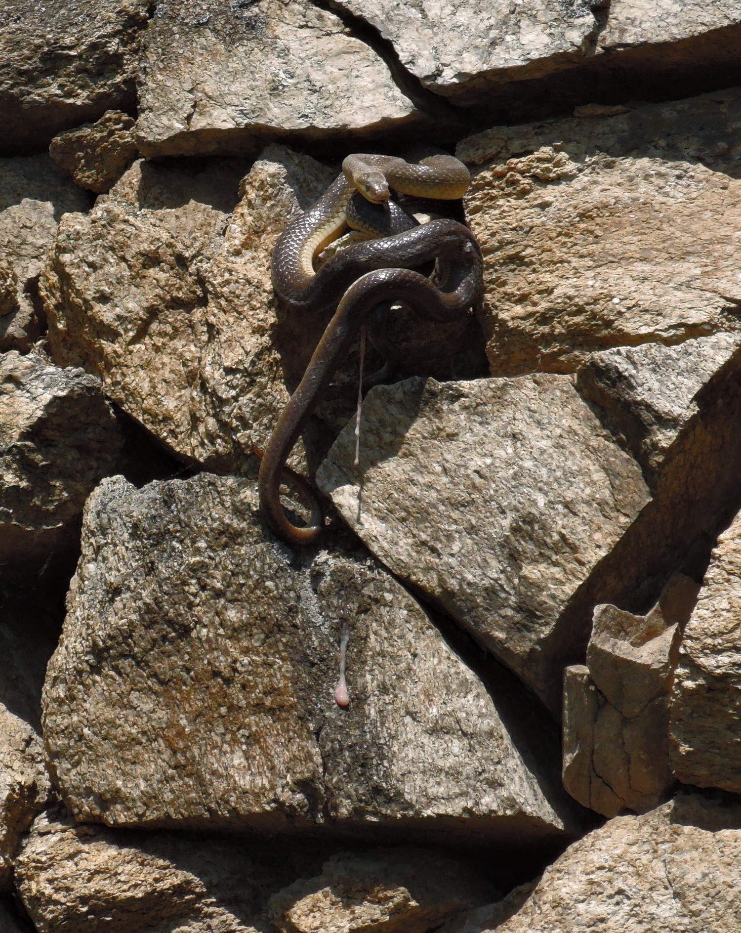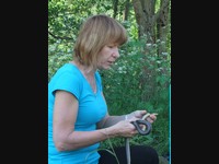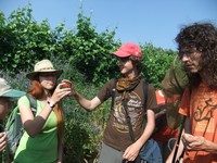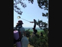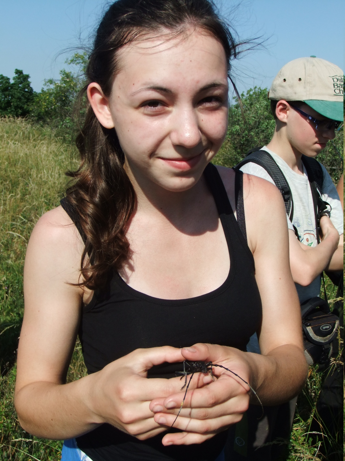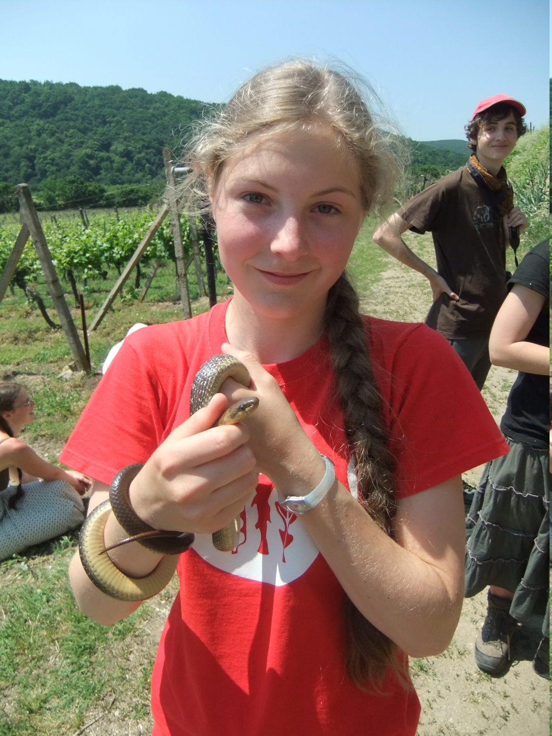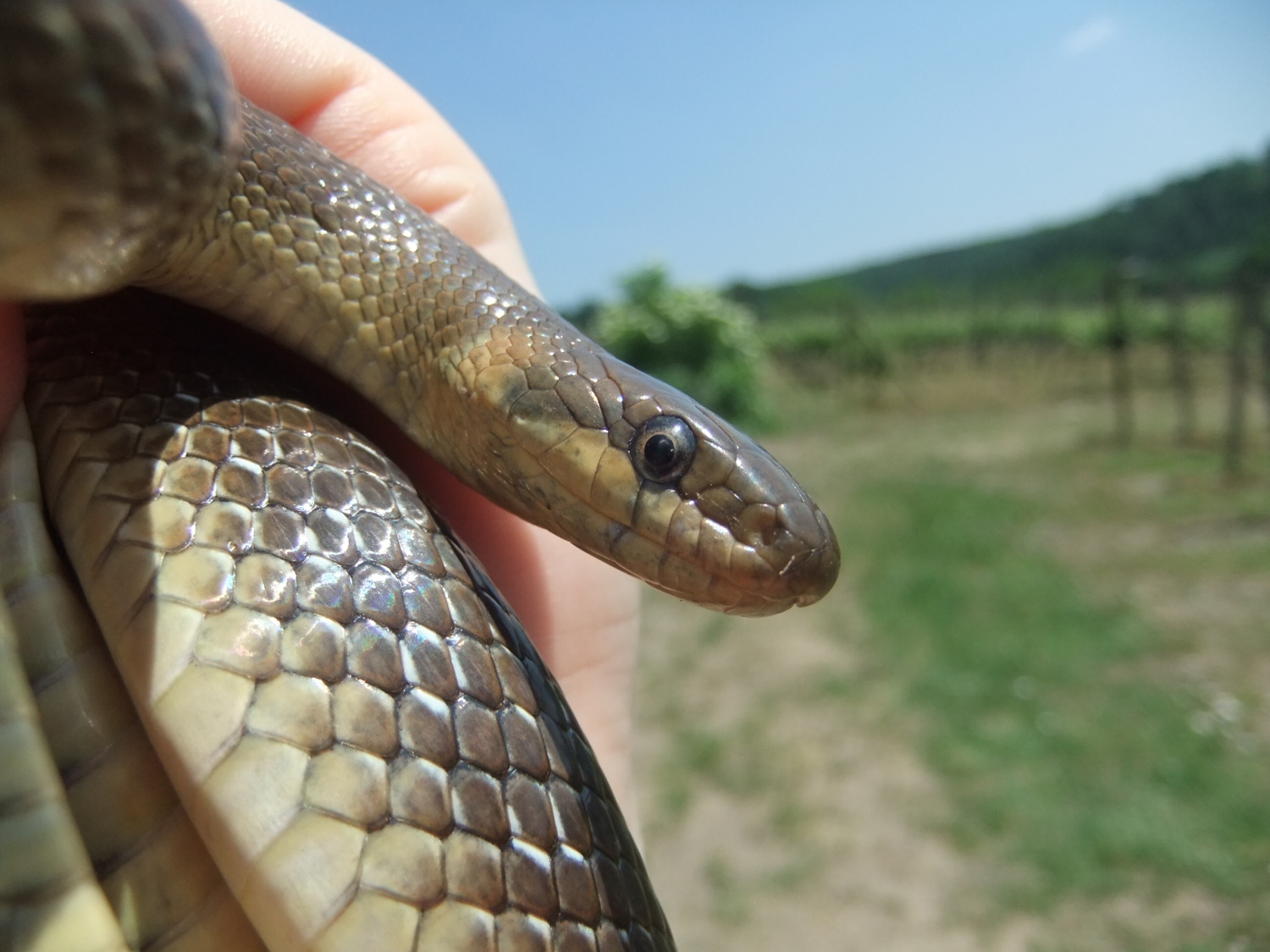 Míšův ,,budíček větší“ vytrhl ze spaní většinu účastníků už v osm ráno a o hodinu později jsme vyrazili směr Šobes. Přes vřesoviště až k Dyji jsme došli celkem rychle, přestože jsme cestou nevynechali jedinou zajímavou biodiverzitu – musím zmínit například Celiinu houbičku Epichloe typhina, protože to byla myšička. Cestou jsme také potkali cosi, co mohlo být kolomazivou gibsodrážkou, a tak jsme raději provedli rituál s Rorippou islandicou a tento nebezpečný objekt opatrně obešli. U Dyje byla pauza na oběd a na koupání. Nebyl by to Koštíř, kdyby se hned nešel vykoupat. Rozjímání u řeky narušila zpráva o první chycené užovce stromové, která vyvolala všeobecné nadšení. Zároveň dorazila Blanka Mikátová, takže jsme měli k chycené užovce i odbornou přednášku. Dozvěděli jsme se, že místní užovky jsou značkovány a sledovány a vyskytují se zde hlavně na zídkách, které tvoří hranice jednotlivých vinohradů. Také víme, že se zde dají nalézt všechny naše užovky, ale my jsme měli štěstí jen na tři z nich – obojkovou, stromovou a podplamatou. Po odprezentování první Aeskulapky jsme zamířili na Šobes. Zde jsme procházeli postupně zídky a doufali, že se nám podaří ještě nějakou užovku odchytit. První, kdo získal Aeskulapův řád, byl Zbojník. Jeho výstavní exemplář užovky stromové byl 146 cm dlouhý a za celou dobu ho nikdo nepřekonal. I já jsem později odchytila svou užovku. Je zajímavé, že všechny užovky, které jsme chytily, byli samci, až na jedinou, kterou chytila Kristýna. Tato samička byla slavnostně pojmenována Stoosma. Celkově se nám za odpoledne podařilo nachytat sedm užovek stromových, což bylo naprosto skvělé. Všechny byly řádně označkovány pomocí kombinace zástřihů do břišních šupin, změřeny, zváženy a vypuštěny zpět. Všechny dostaly i jméno, například Durian, Chrudoš, Zbojník, Tamarind, Stoosma… Naskytl se nám i jeden úžasný výjev – na zídce jsme zahlédli dvě pářící se užovky stromové. Je dobře, že se postaraly o další generaci. Nicméně my jsme se vydali na vrchol Šobesu a poté směrem zpět k Dyji. Cestou jsme náhodou narazili na velmi důležitý objekt a to na Míšův snopek číslo 1. Z rostlin zde kvetli například kosatce pestré a rmeny barvířské. Ve vinařské chajdě se nacházel plch velký. Jakožto krásnou myšičku, rozhodl se Albert, že ho odchytí. Plch byl opravdu krásná myšička, ale kousal pořádně a Albertovi nepomohly ani rukavice – přesto díky jeho postřehu a odvaze jsme si mohli plcha všichni prohlédnout. Poslední zastávka toho dne se konala na Lipinské louce, kde jsme nakoukávali pod plachty a doufali, že zde bude odpočívat nějaký plaz. Nalezli jsme dva slepýše a dvě užovky podplamaté. Obě byly velice naštvané, když jsme je vyrušili a daly nám to patřičně najevo – někteří účastníci si tak odnesli i ,,voňavý“ zážitek. Po návratu na faru na nás čekal Matyáš s moc dobrým buřtgulášem. Predací večeře však sobotní program nekončil, neb Míša provedl pitvu hnízda včel rodu Ceratina, na kterých provádí zde v Podyjí výzkum. Většina účastníků se ještě po setmění vydala na lov nočního hmyzu na světlo. Bylo vidět mnoho nočních motýlů a lišajů a také se chytil krásný sameček roháče obecného.