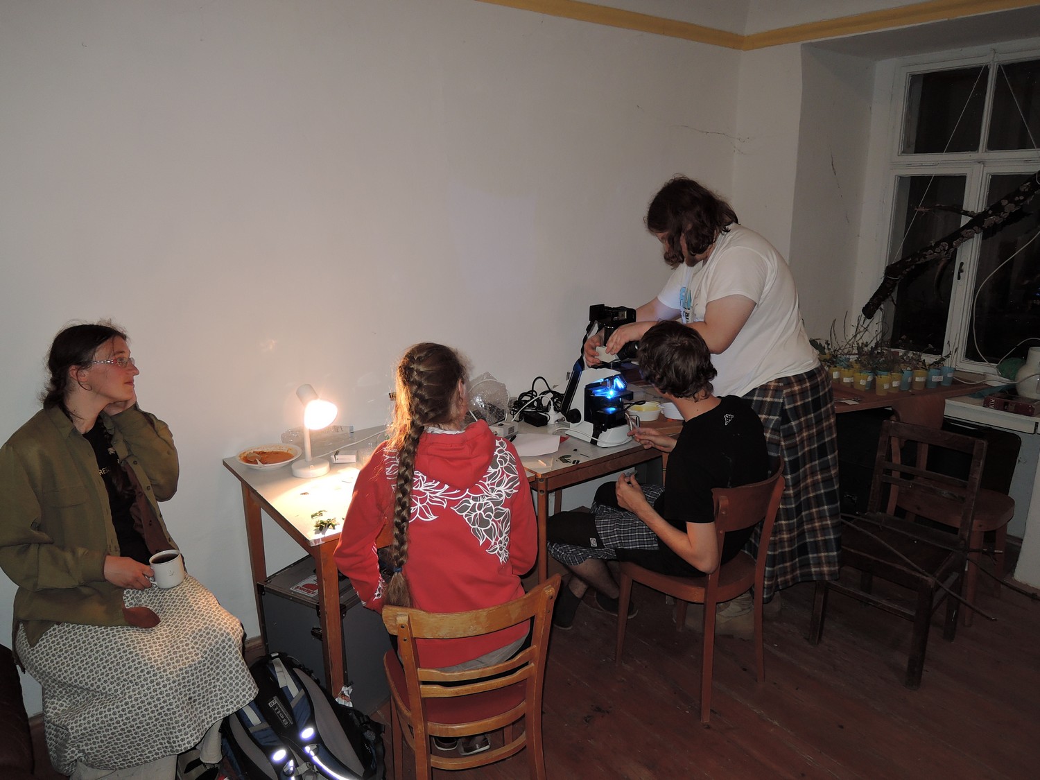 Po večeři přednesl večerní přednášku Mojmír Vlašín. V první, spíše stručnější, části se věnoval tématu Politika ochrany přírody a účastníci si zatím připravovali otázky na následnou diskusi. Diskuse byla velmi zajímavá, pestrá a rozsáhlá. Objevily se velmi osobní a konkrétní otázky (Jaký je váš nejoblíbenější druh netopýra?) i otázky spíše neosobní a obecné (Co nejvíce chybí ochraně přírody v ČR? Co máme dělat, aby se to zlepšilo?). Večer jsme dále mikroskopovali, diskutovali, exprimovali. Mně se moc líbilo mikroskopování trilobitího složeného očička.