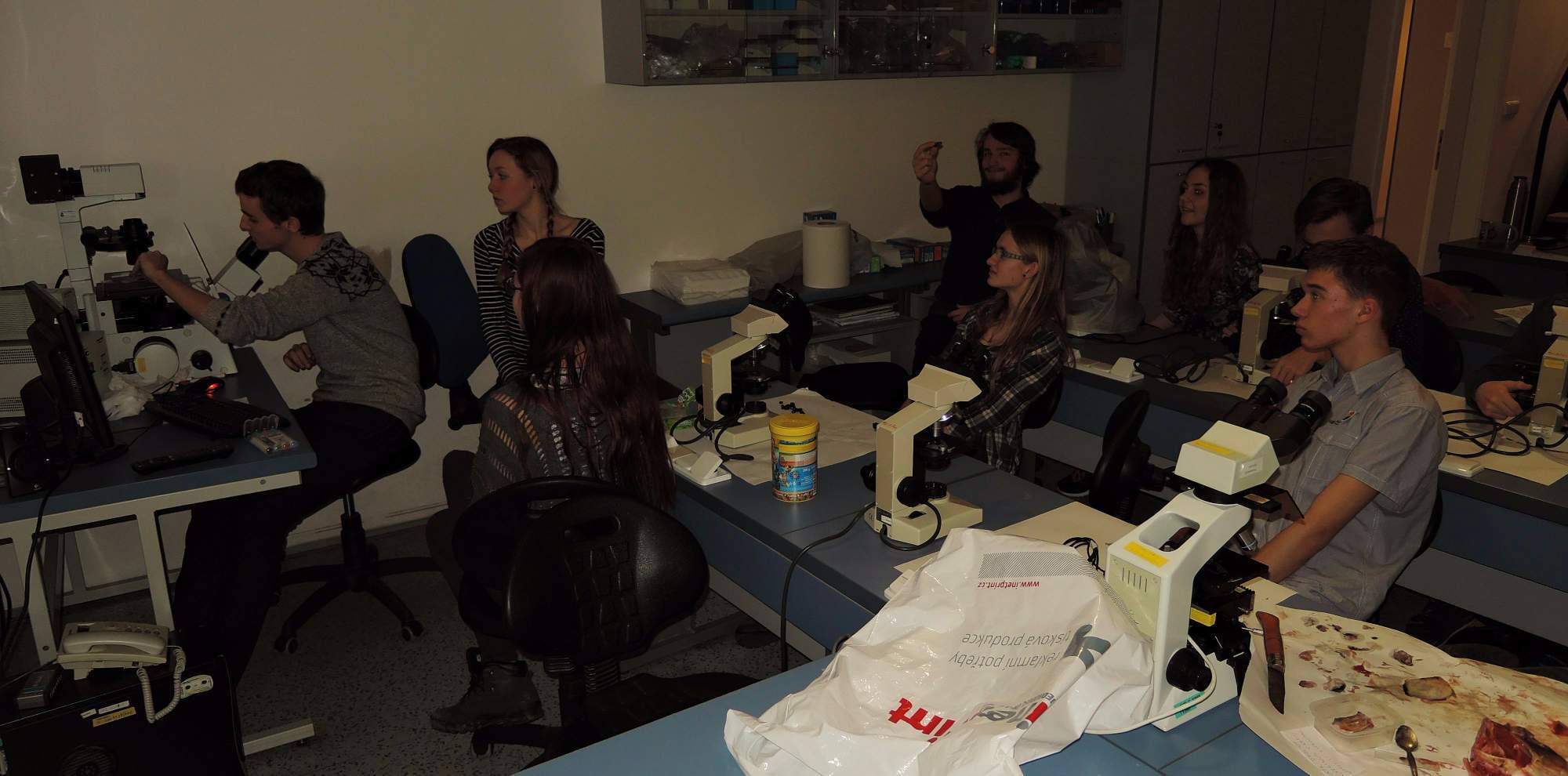 Nezasvěcený jedinec by si možná pomyslel, že toto je poněkud depresivní, avšak hluboký vrchol bohatého dne. Není tomu tak. To velké teprve čekalo: kochání se mikrokrásami biodiverzity pod fluorescenčním ó-mikroskopem! To vše za kvalitního akustického doprovodu, zurkotu odborného rozhovoru a jiných exprimací.