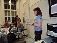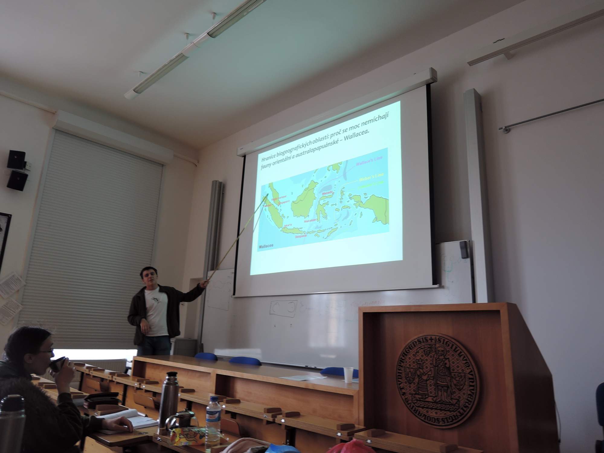 Jelikož je okolo třetí hodiny a sraz a registrace je na fluonoci od jedné do tří, cestou od metra skoro běžím. Fluonoc je návyková. Vyběhnu schody a začínám potkávat naprosto neznámé lidi. Jsem čím dál tím zmatenější, u stolku s registrací je nějaká cizí paní, a když nakouknu do Stoosmy, všichni na mě koukají divně. A já na ně taky. Poslední nadějí pro mě je entopracovna, kde naštěstí sedí Jirka a vede mě do menší místnosti v nejvyšším patře, kde právě probíhá přednáška Pavla Stopky o feromonech savců. Mávám na ostatní a sedám si na volnou židli na kraji (pod kterou leží Koštíř). Po přestávce je další přednáška o obskurních jevech spojených s meiosou a přednáší Majda Holcová. Nejprve nás seznamuje s meiosou a mitosou obecně, včetně základních pojmů, pak se spoustou zajímavostí a nakonec pouští dojemné video o rozmnožování. Nač se dívat na akční filmy, tohle je mnohem napínavější!!!