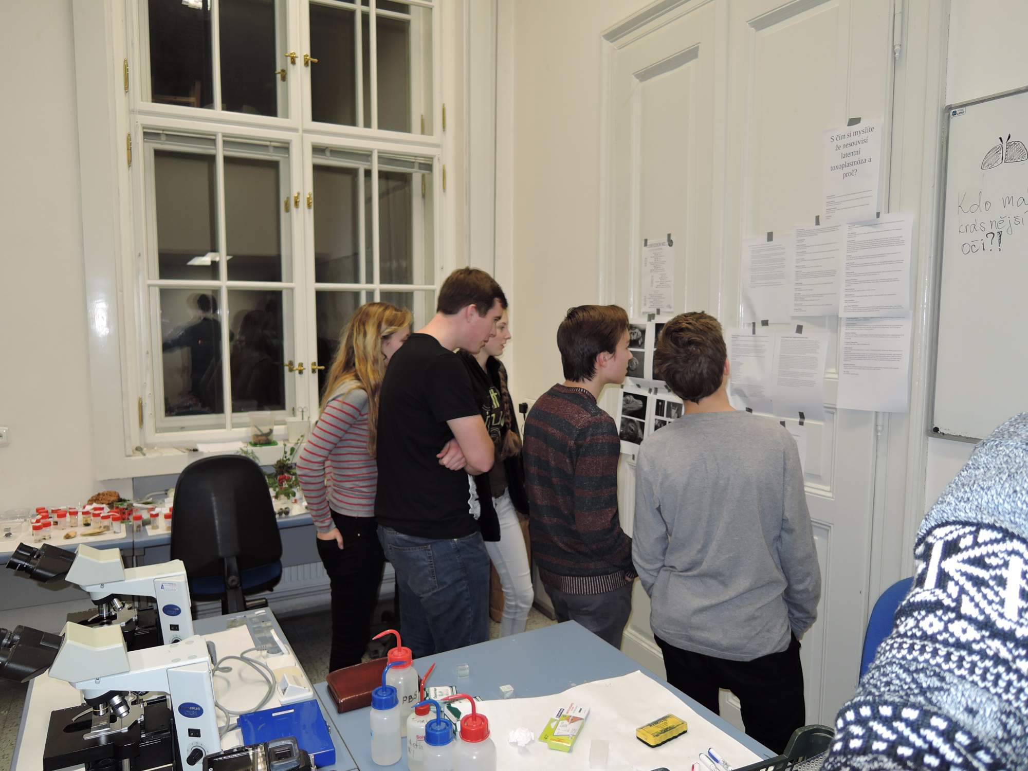 Jelikož jsou kamrlíky vědců malé a temné, rozdělili jsme se na dvě skoropoloviny. Jedni zamířili k elektronovým mikroskopům, transmisnímu i rastrovacímu. Tyto krásné mašinky za ještě krásnější sumy (třeba čtvrt milionu za držátko) nám byly předvedeny přímo v akci. Elektronová mikroskopie však není žádná sranda – jen příprava vzorků se neobejde bez takových dryáků, jako je kyselina osmičelá.