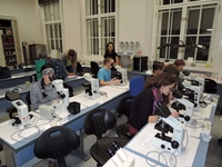 Následovala večeře u predivního stolu, Mumínkova přednáška o fluorescenční mikroskopii a dobrovolné aktivity – mikroskopování, povídání a zpěv za doprovodu kytar a flétny.