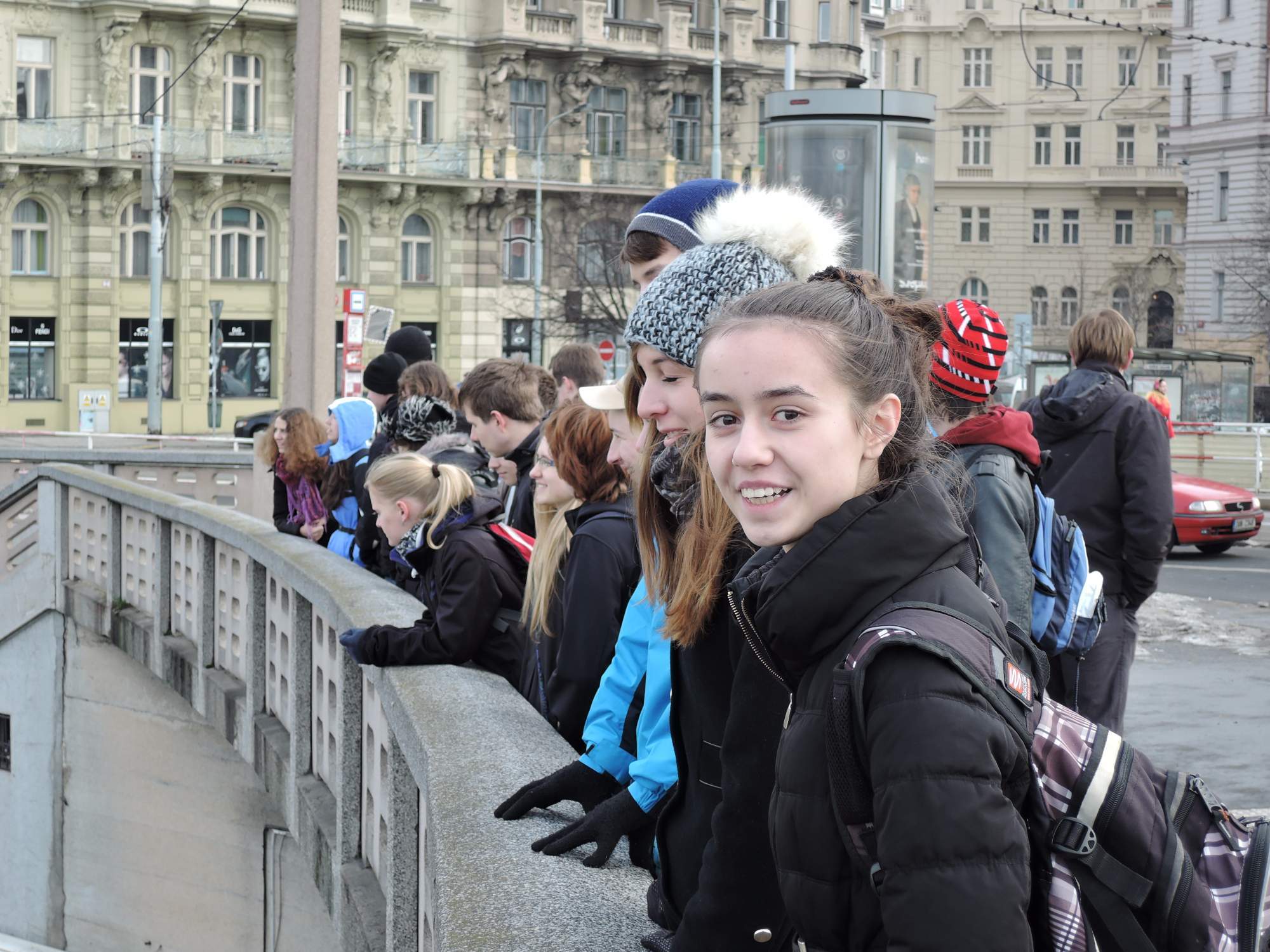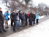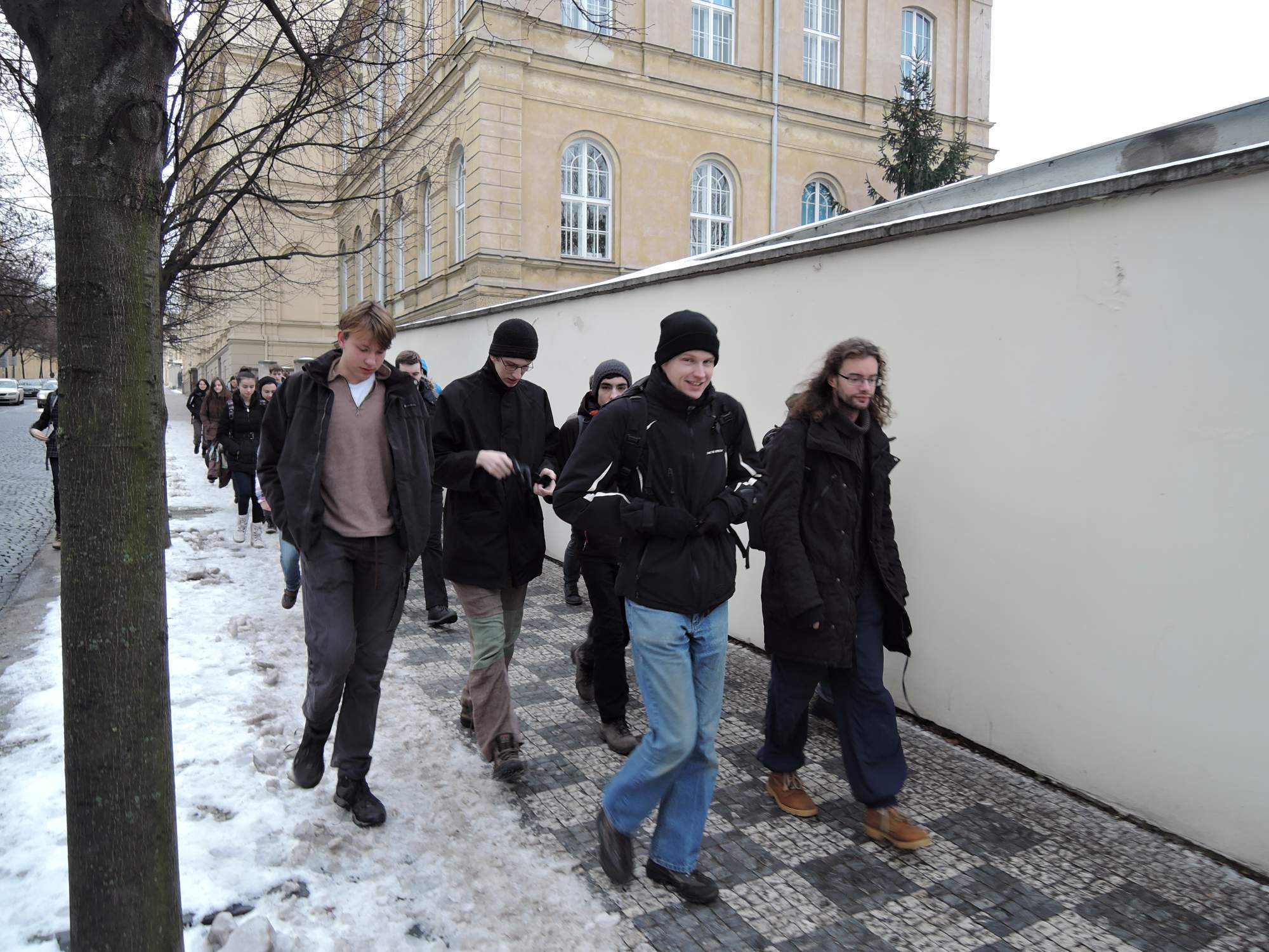 Následujícího dne byla na programu vycházka po nejvýznamnějších místech Matky měst – Prahy. Odborný výklad z historie samozřejmě nechyběl, za což děkujeme především Fazoli, Petru Dolejšovi, Jirkovi a panu a paní Hadravovým. Postupovali jsme asi takto: z Viničné na Karlovo náměstí a Faustovu domu, pak k Vltavě. Podél nábřeží kolem domu Mánes k národnímu divadlu, od něho stále po proudu až ke Karlovu mostu a Klementinu. Malá odbočka ke zbytkům Juditina mostu a pak přes řeku na Malou Stranu. Skrz Malostranské mostecké věže až na Malostranské náměstí. Odtamtud (posíleni o Hadravovy) potom po Nerudově ulici až k Hradu. Následovala galerie ve Šternberském paláci, částečně jako únik před kousavým chladem. Dále pak Loreta a strahovské zahrady, z nichž jsme už zamířili zpět, neboť čas tlačil.