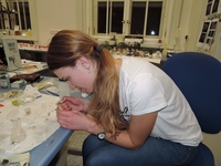 Nakonec jsme se dočkali i příchodu Karla Kodejše s olihněmi a praktikum mohlo začít. Po teoretickém úvodu a ukázkové pitvě jsme se pustili do práce v tříčlenných skupinkách. Aby nebyla nuda (a aby bylo „něco vidět“), pokusili jsme se aplikovat do trávicí a oběhové soustavy vodu s rozpuštěným barvivem. Nutno dodat, že chirurgii by se mohlo věnovat jen pár vybraných jedinců a některým lidem jehly do ruky prostě nepatří, takže na závěr většina olihní plavala v nevábně zelenohnědé vodě. Jen jedna miska skončila růžová, což však bylo způsobeno spíše výběrem barev.