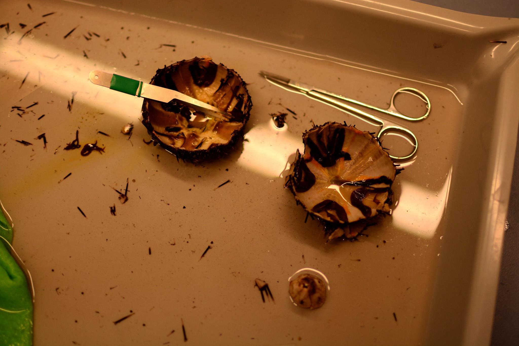 Po návratu na fakultu nás už čekala přednáška o mořské fauně Jadranu od Jirky Hadravy a Evči Matouškové. Ti pro nás z expedice dovezli i sumýše a ježovku, které jsme společně vypitvali. Nejvíce obdivu a zkoumání si vysloužila Aristotelova lucerna a vaječníky ježovky, které prý působí jako afrodiziakum. Velká část účastníků se je rozhodla ochutnat.