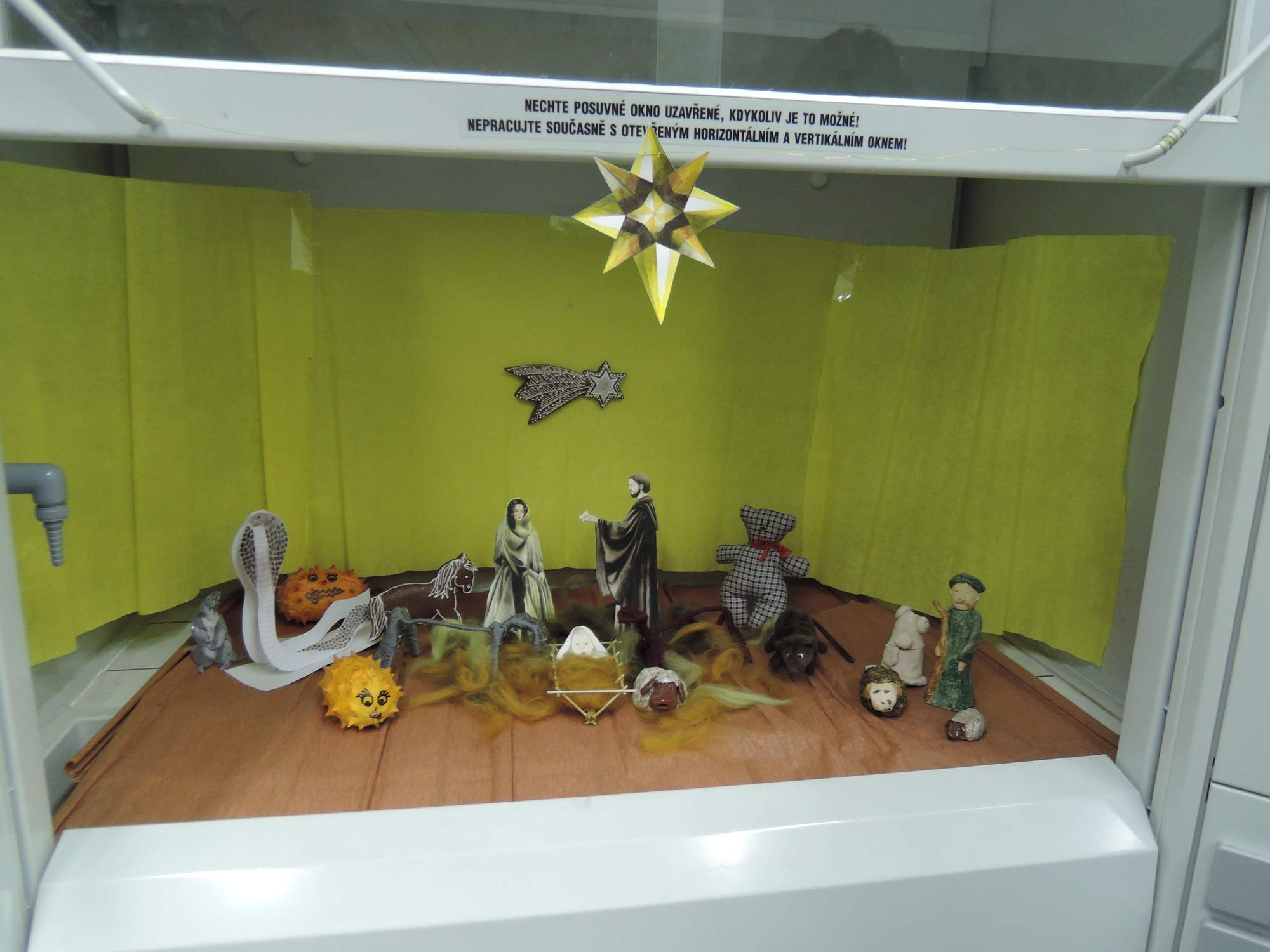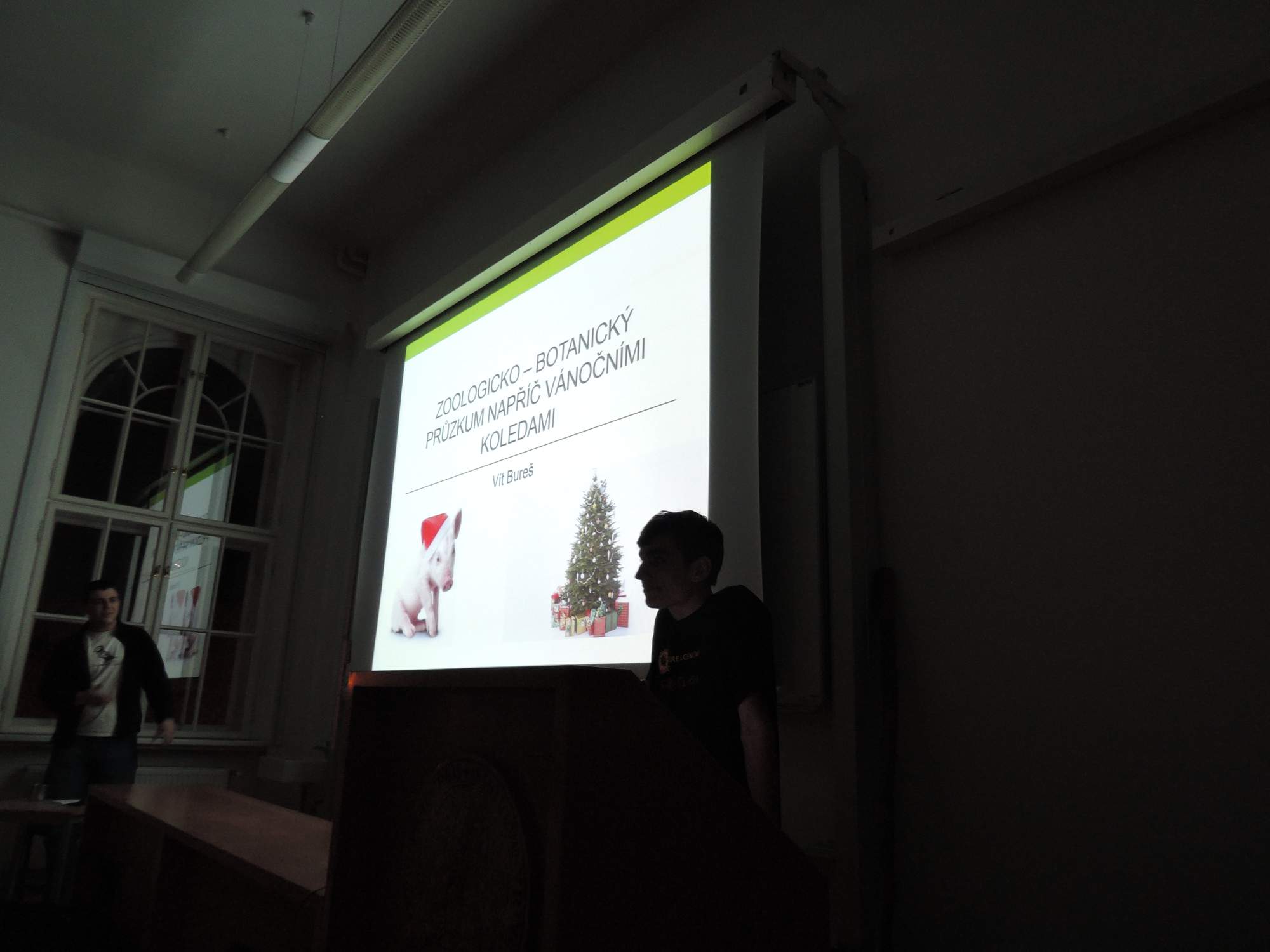 Až na máslo a jako nehudebníkovi i hudební nástroje se mi vše povedlo vtěsnat do batohu a vyrazil jsem vstříc svatostánku biologie a fluorescenční mikroskopie. Je sice pravda, že žádná „Viničná hvězda“ mi v orientaci nepomáhala, což se trochu podepsalo na mé výsledné trajektorii při pohybu centrem Prahy, ale nakonec jsem cíle přeci jen nalezl. Zcela promrzlý jsem s nadšením vstoupil do budovy, ale několik následujících okamžiků si pamatuji jen mlhavě, což v tomto ročním období lidé nosící brýle zajisté znají. Mohu se tedy jen po hlase domnívat, že to, co kolem mne proběhlo, byla vždy se smějící Zuzka. Po registraci, odevzdání přihlášky, přivítání se s organizátory, přivítání se s organizátorkami, představení se navrátilému hlavnímu organizátorovi, pozdravení účastníků, účastnic ... a dalším zdvořilostním náležitostem nastal čas na první bod programu, tedy soutěž o nejlepší, nejideologičtější a v neposlední řadě i nejchutnější cukroví. Účast nebyla nikterak malá a některé prezentované cukrovinky byly opravdu ... řekněme ... speciální. Nezapomenutelně na mě zapůsobily především úžasně křupavé perníčky s příchutí popela dubu červeného. Zatímco velevážená porota degustovala a hodnotila, my ostatní jsme se věnovali jinému typicky vánočnímu elementu – kaprovi. Akorát jsme ho nijak nebodovali, až na výjimky ani neochutnávali, nýbrž pod Albertovým vedením detailně pitvali (i když z Karlova pohledu možná spíše filetovali). A vlastně ani nešlo o kapry, ale o malé perlíny a karasy. To ale nijak nevadilo, i tak se všem vánoční nálada zajisté dostavila. Ta byla navíc ještě následně umocněna další přednáškou v režii Míši Mikáta na téma anatomie vánočního stromečku. Byli jsme tedy více než připraveni na další část večera, tedy příchod Tří králů, okradeného pastevce a samotného zbojníka Jánošíka k právě narozenému Ježíškovi. Na zdařilé kulturně-ideologické obohacení večera jako snad vždy plynně navazovalo všeobecné představování následované chutnou večeří. V průběhu večera byl také dokončen velkolepý digestořový betlém, kde se vyjímala i kobra královská nebo Megatherium. Až do brzkých ranních hodin se poté za zvuku hudebních nástrojů a písní pilně excitovalo u fluorescenčního mikroskopu nebo se vedly vysoce odborné diskuze.