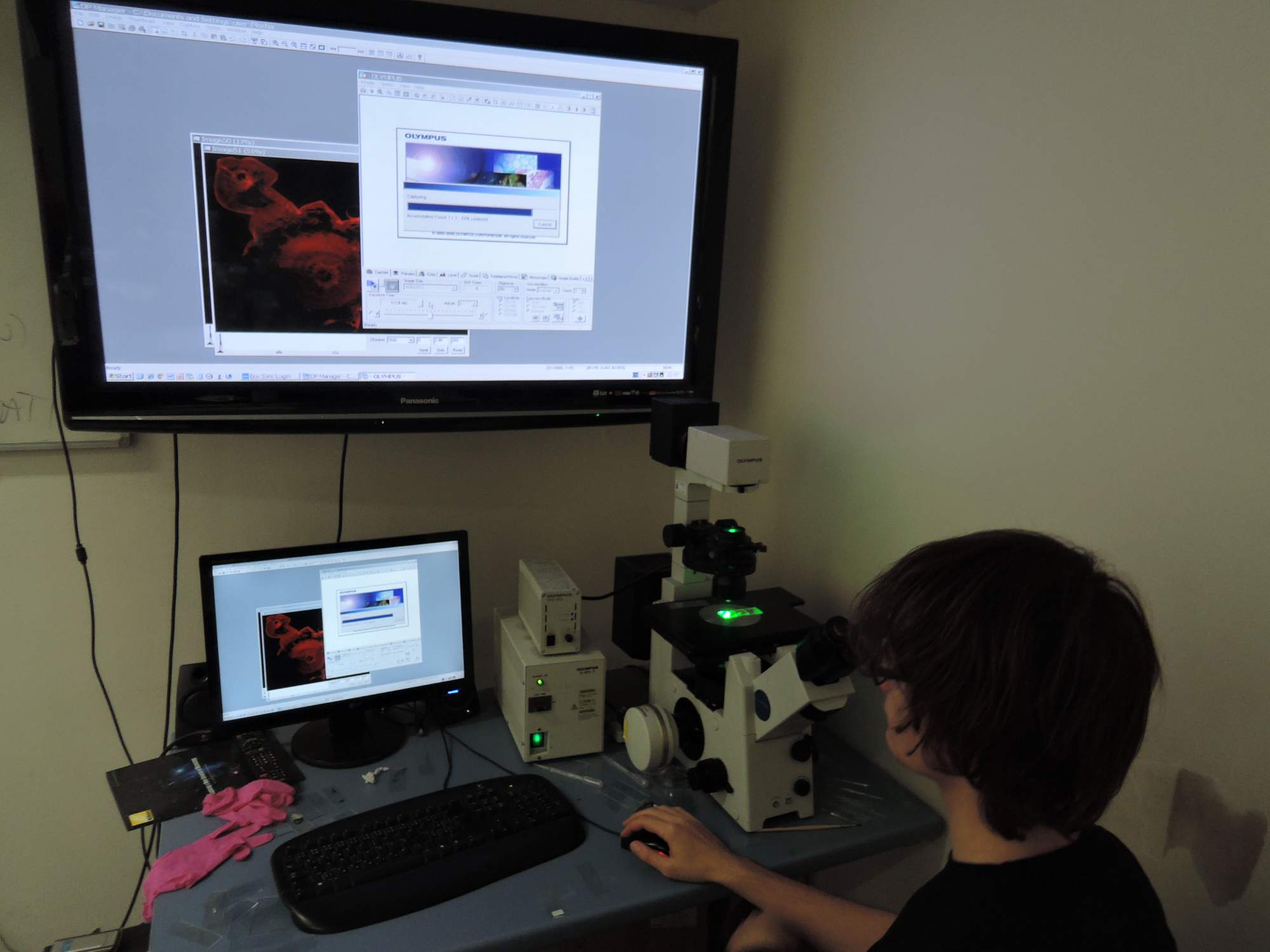 Druhá část exkurze nás pak zavedla k místnostem vybaveným konfokálním a fluorescenčním mikroskopem (přece jen to má být Fluorescenční noc). Ty už byly o něco levnější, takže nám bylo dovoleno si je osahat vlastníma rukama. Zajímavým poznatkem bylo zjištění, kterak pracovníci zviditelňují laserové paprsky, když s nimi pracují – zakouří je elektronickou cigaretou :D