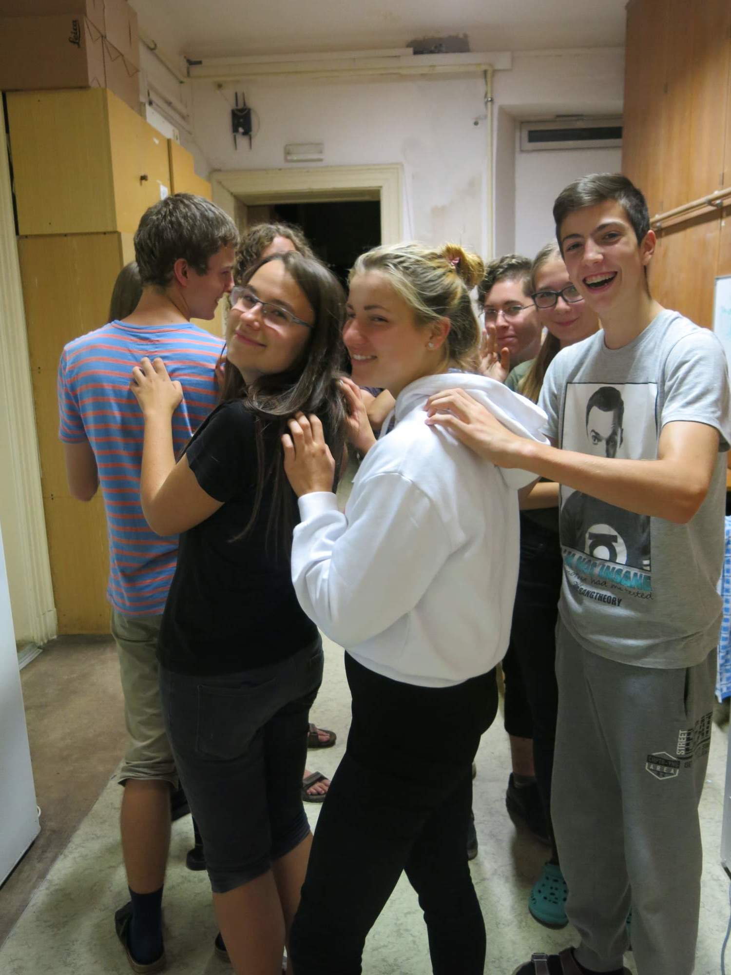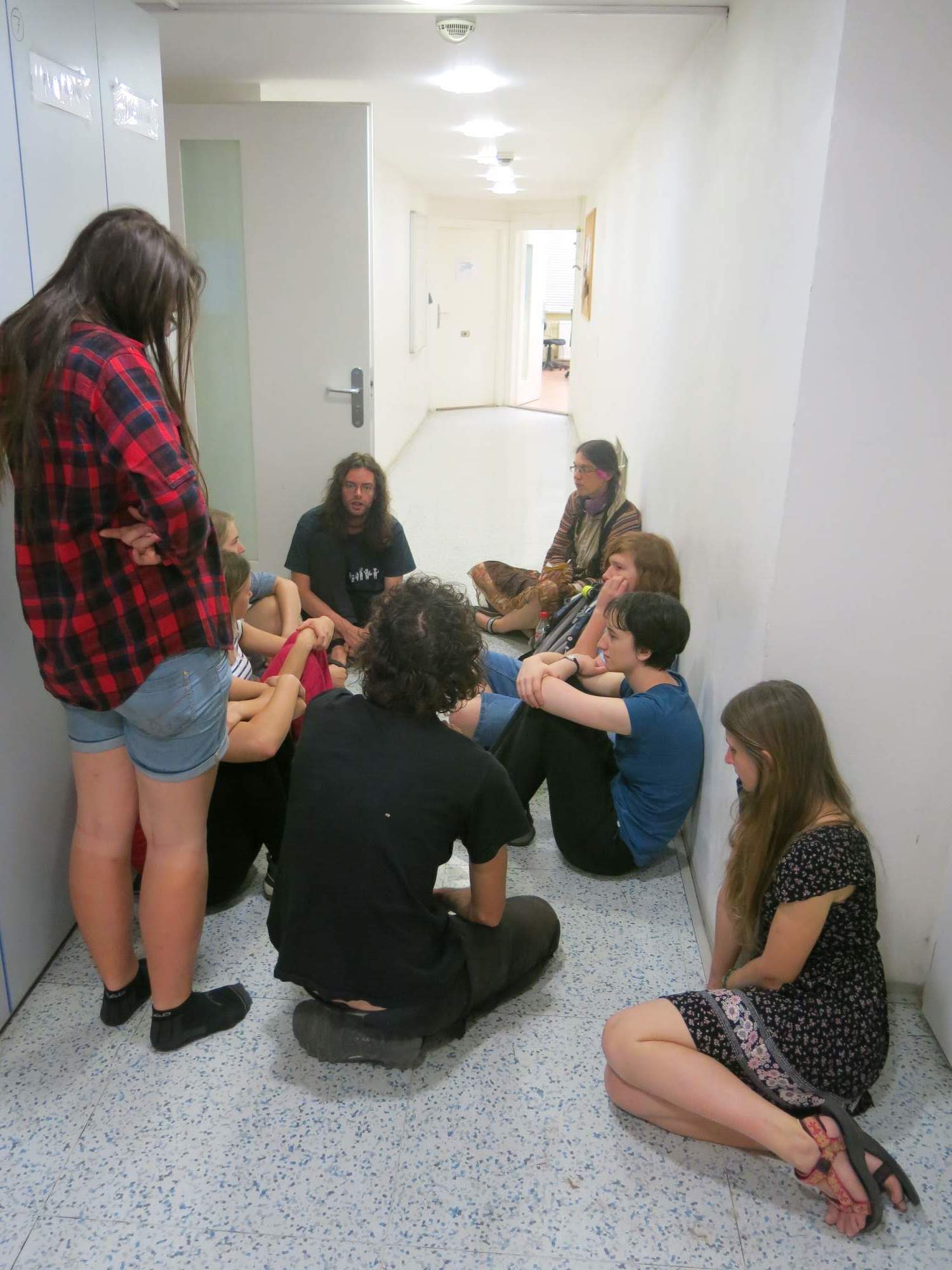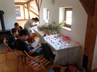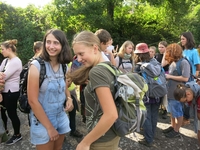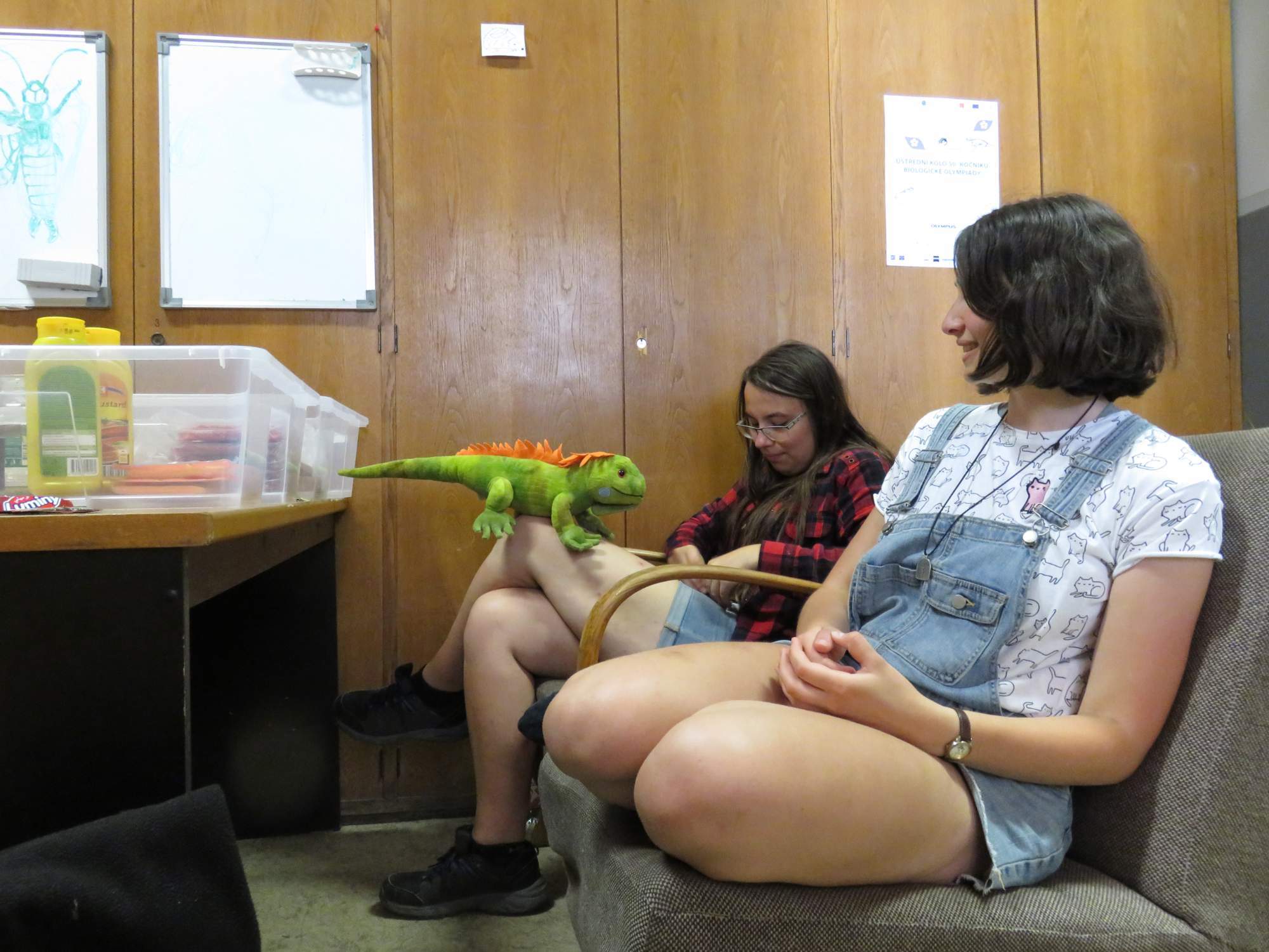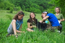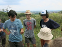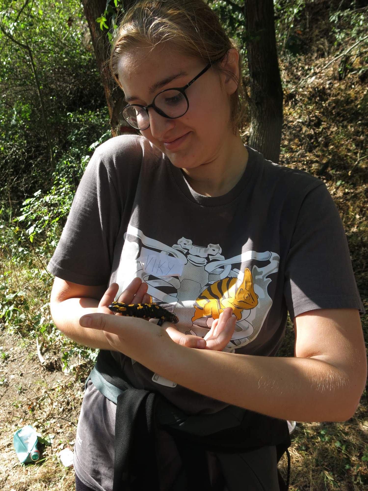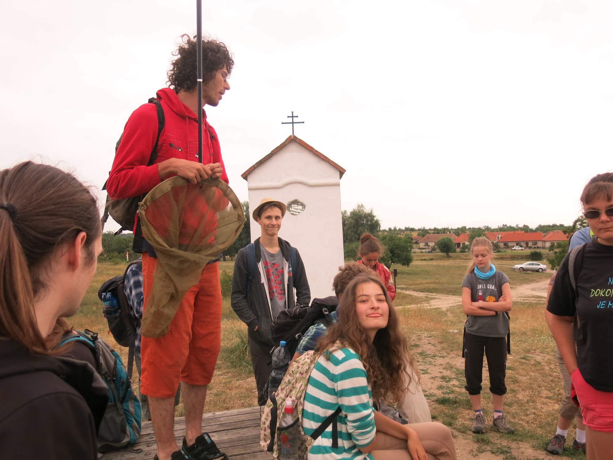 Další den jsme se vydali kolem studánek s osvěžující vodou na Šobes, kde se vyskytuje největší množství užovek stromových (Zamenis longissimus) v ČR. Bylo jich chyceno celkem pět. Změřily se, zvážily se a označkovaly se. Ti, jež užovky chytili, dostali aspoň prozatím pivní tácky s užovkou. Tentokrát jsme se vrátili o něco dříve, za což jsme byli velmi rádi, protože jsme si mohli dát konečně příjemnou sprchu. Po večeři jsme opět byli ukecáni k tanci. Také se zpívalo a stihlo se i pár hodin spánku. V sobotu jsme se prošli kolem kompostu nad nímž létaly žahalky. Následně jsme šli k zarostlému mělkému jezírku, kde Hejkal chytil užovku obojkovou (Natrix natrix) a také zde bylo velké množství roztomiloučkých rosniček zelených (Hyla arborea) nebo krásně zbarvená kuňka obecná (Bombina bombina). Byla jsem zklamaná, že nepoznám Anthrax a pletu si ho s dlouhososkou kuklicovou (Hemipenthes morio). Evidentně mi nestačilo, že jsem nedávno zjistila, že včelka Mája je ve skutečnosti pestřenka. Z exkurze jsme se vrátili brzy, protože nás čekala poznávačka a po ní komplexní fenomén v podobě příšerně zamotaného labyrintu. V neděli proběhlo vyhodnocení labyrintu a poznávačky. Začalo hromadné uklízení, loučení a postupný odchod všech zpět do civilizace. A tak skončila výjezdní FN v Podyjí.