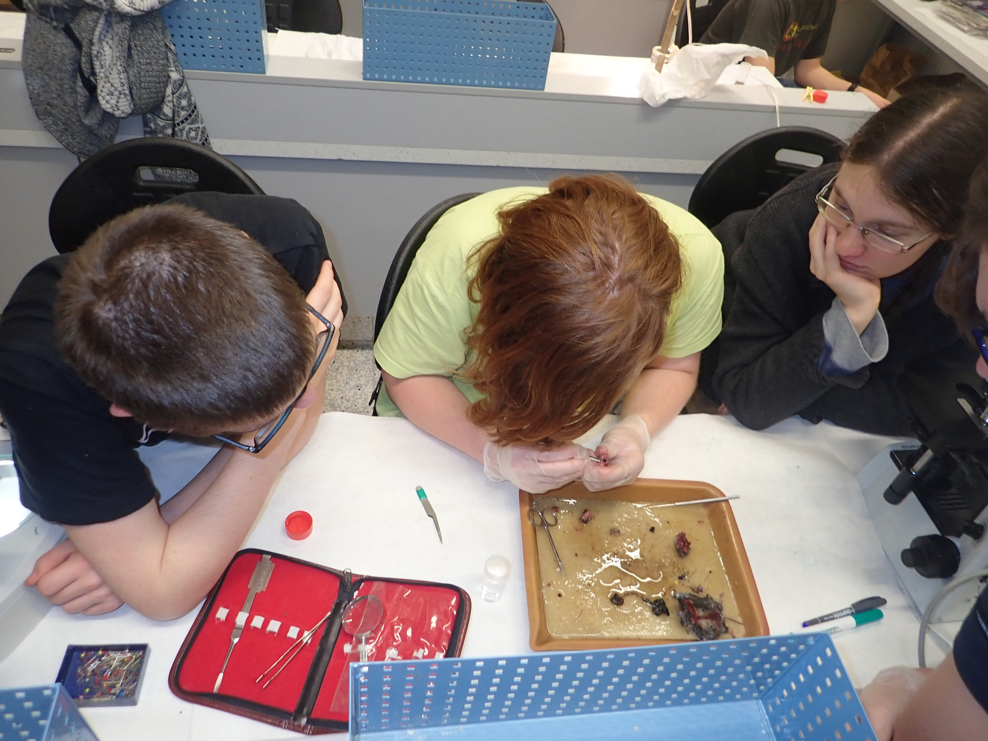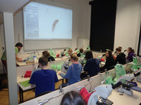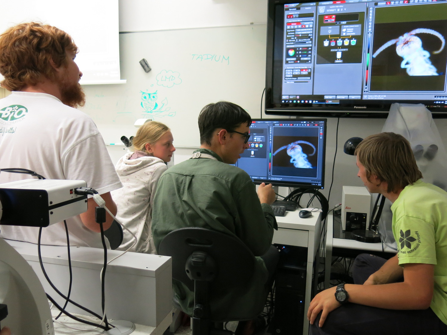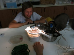 Velmi důležitým aspektem Fluonoci je mikroskopování, a to, jak název napovídá, zejména mikroskopování fluorescenční. Není proto divu, že povzbuzeni znalostmi z letošní brožurky k BiO jsme se rozhodli rozpitvat a zmikroskopovat račí embryo. Ne vše sice šlo zcela podle plánu, ale i tak to byla skvělá večerní zábava, kterou jsme prokládali duchaplnými diskusemi či poslechem chytlavé hry na kytaru v podání hlavní vedoucí Evči.