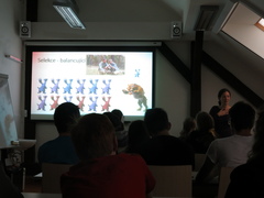 Z nejzazších koutů střední Evropy a sluneční soustavy se sjeli delegáti nejrůznějších škol a institucí k diskutování otázek mezi nebem a zemí, ale také i na nebi a v podzemí, zkrátka všude tam, kam až sahá království biologického života. Program začal zostra. Hned po příjezdu nám byla předložena jedna z nejzajímavějších otázek biologie - jak a proč vzniklo pohlavní rozmnožování? V přednášce Jan Toman poskytl zajímavé indicie o možném pachateli. Za to, že odlamování kusů stélky, způsob rozmnožování veskrze elegantní, jsme nahradili starostmi spojenými s hledáním partnera, prý částečně může i kyslík. Na příští návštěvě rodinné poradny si stěžujte právě na něho. Naše rozladění z „kyslíkového holokaustu“ rozptýlil Petr Hampl v přednášce o anaerobních eukaryotech ukázkou hrdinných přeživších zmíněného mikrošoa, kteří se svými tajemnými cestami dýchání bez kyslíku stále přebývají v místech vzduchu zapovězených. Nejenom přednáškami je člověk živ, a fluonoční účastnictvo se odebralo socializovat, konzumovat poklady predivního stolu a mimojiné válčit o místo u fluorescenčního mikroskopu. V rámci organizovaného networkingu jsme se seznámili navzájem i s formou péče o opuštěná mláďata kaloňů v australských záchranných stanicích, lépe známé pod pojmem netopýří burrita.