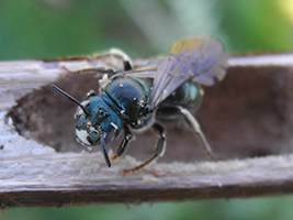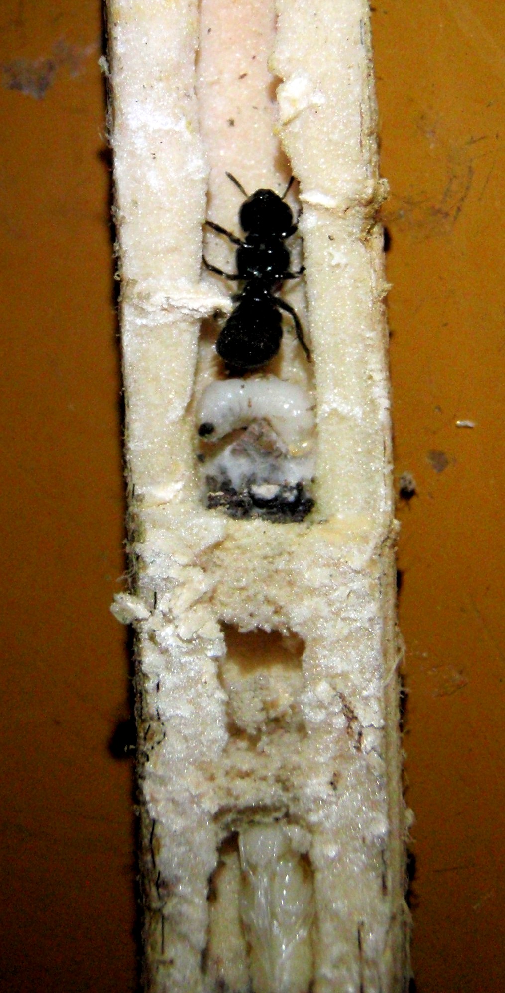 Samice si v duši vyhloubí chodbičku a poté do ní nosí pyl a nektar. Když vytvoří dostatečně velký bochánek pylu a nektaru, tak na něj naklade vajíčko, z duše nastrouhá piliny a buňku uzavře. Takto vytvoří ve hnízdě přibližně osm buněk. Poté, co buňky dozásobuje, tak hlídá vchod hnízda před predátory a parazity až do dospělosti svých potomků. Může rovněž procházet dovnitř hnízda a čistit alrvy od parazitů a od trusu. Vývoj od vajíčka po dospělce trvá přibližně měsíc. V mírném pásu tedy přezimuje ve stádiu dospělce. Na zimu si může vytvořit další krátké tunely.